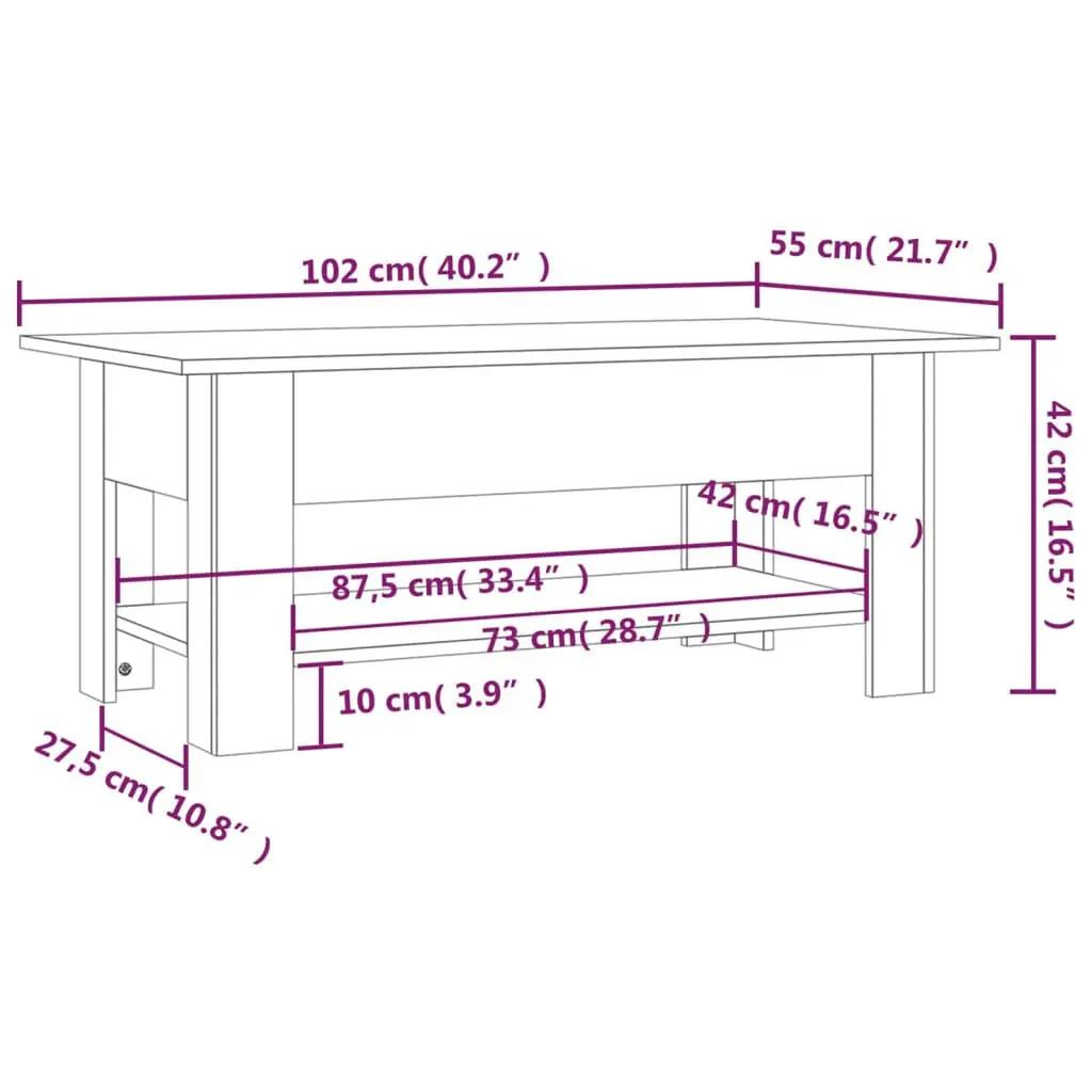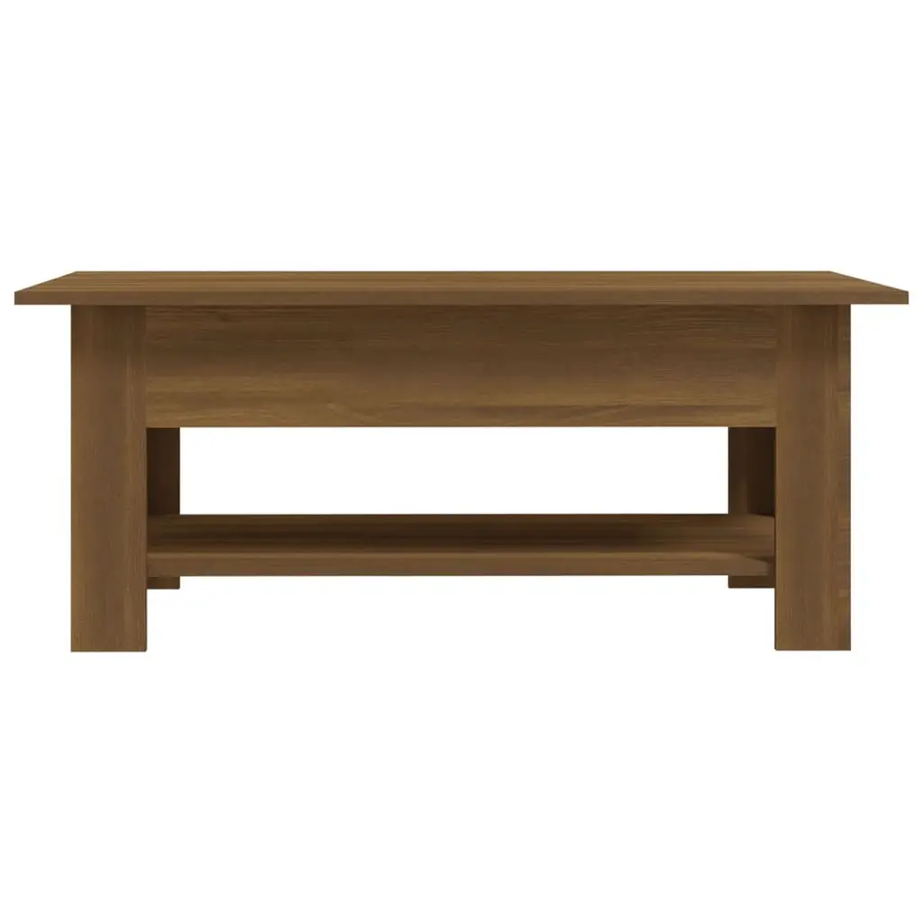 This stylish coffee table made from engineered wood has a modern feel, perfect for livening up your living room. With its lovely brown oak finish, it blends contemporary style with practicality, making it a great centerpiece for gatherings or daily life. Stylish Design: The sleek modern look of this coffee table fits in with any decor style and adds a classy touch to your living space. Whether it's in a minimalistic setting or a traditional one, it adapts easily to different styles.Ample Storage: With a sizable under-shelf, this coffee table offers easy storage for magazines, remote controls, or decorative items, keeping your space tidy and clutter-free.Durable Material: Made from tough engineered wood, this table promises durability. Its sturdy build ensures it handles everyday use while looking great, making it a valuable addition to your furniture.Easy Maintenance: The matte finish means cleaning is a breeze—just wipe it down with a dry cloth, and it stays looking good. Skip harsh chemicals to keep the surface nice for the long haul.Optimized Space Usage: At 40.2 in long, 21.7 in wide, and 16.5 in high, this compact table suits smaller spaces while providing a useful surface for coffee and decor, without dominating the room.