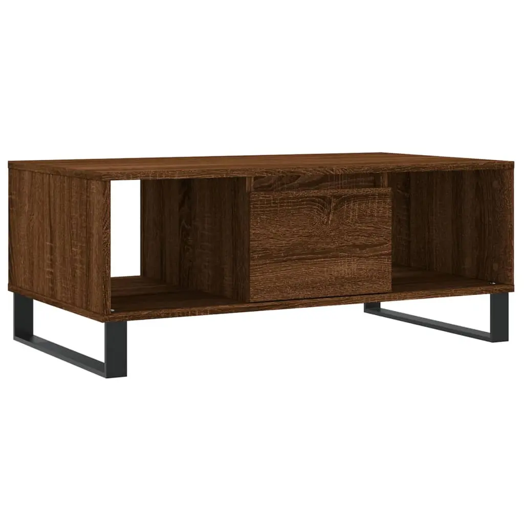 This coffee table is a modern addition to any living room, offering both style and functionality. It's built from engineered wood and iron, featuring a lovely brown oak finish that adds warmth and elegance. It's a practical size, with clean lines and a smooth texture that makes it a chic centerpiece for social events or quiet nights in. Ample Storage: This coffee table has two shelves, perfect for keeping magazines, books, or decorative bits tidy.Modern Design: The sleek rectangular shape with a matte finish fits well into various decor styles, from contemporary to minimalist.Durable Construction: Made from engineered wood with strong iron legs, this table merges style with sturdiness, providing a stable place for drinks and decor.Versatile Functionality: Whether for coffee service or as a side table, it's an excellent fit for both casual and posh occasions.Easy Maintenance: The smooth surface is a breeze to clean, keeping it looking sharp with just a quick wipe.