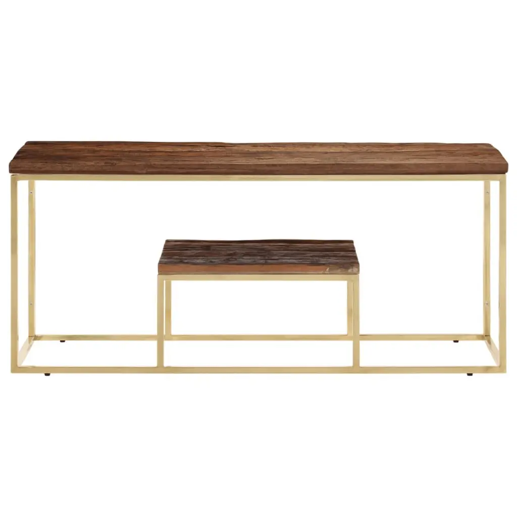 This Gold Stainless Steel and Wood Coffee Table is ideal for giving your modern living space a centerpiece that combines style with practicality. The shiny stainless steel frame and solid wood surface make it a treat for the eyes while ensuring it’s tough and easy to clean, making it a perfect addition to your decor. Elegant Aesthetic: The rich brown wood surface paired with the metallic gold frame creates a warm vibe and elevates your living area. It’s a piece that gets people talking while adding a bit of class.Sturdy Build: Made from solid stainless steel, the frame holds a lot of weight, making it durable for daily use while keeping its good looks for years.Easy Maintenance: With its stain-resistant top, this coffee table is a breeze to clean. Just a quick wipe with a damp cloth keeps it looking sharp, so you can relax more with loved ones and worry less about upkeep.Versatile Functionality: Perfect for serving coffee or snacks, it can also hold decorative items, books, and magazines, making it super handy for various uses in living rooms, hallways, or cafes.Generous Dimensions: At 43.3 in long, 17.7 in wide, and standing at 17.7 in high, it offers loads of space for guests without skimping on style or comfort.