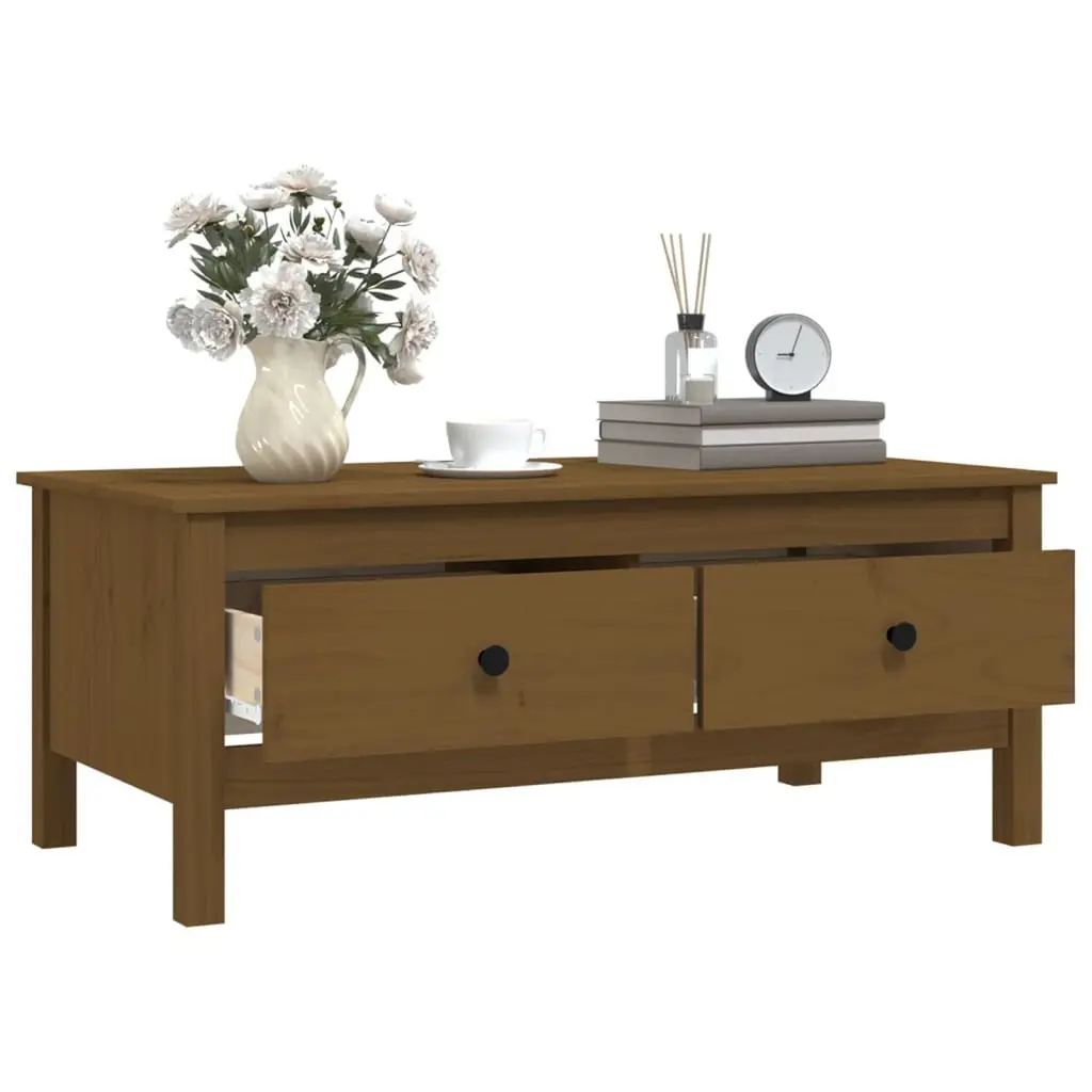 This coffee table adds a warm feel to any living room with its rustic honey brown finish that highlights its natural grain. It's not just a pretty face; it's also super practical—great for drinks, books, or decor, and it'll fit in nicely with your existing stuff. Ample Storage: This coffee table features two spacious drawers crafted from solid pine wood, allowing you to store magazines, remotes, and other essentials out of sight, keeping your living space tidy and organized. With its smooth-rolling design, accessing your stored items is simple and convenient. Classic Design: The honey brown color and rustic style of this coffee table match a variety of decor. Its timeless look ensures it won't go out of style anytime soon, making it a great addition to both traditional and modern homes. Sturdy Construction: Built with a solid pine wood frame, this coffee table is tough as old boots. The solid surface holds up to daily use while keeping its good looks, so you can enjoy it without stress. Versatile Use: This coffee table can do it all—from holding drinks during family catch-ups to being a stylish base for your decorative items. It fits just right in living rooms, lounges, or cozy reading nooks. Easy Maintenance: With a matte finish that resists scratches and stains, keeping it looking good is a breeze. Just give it a regular dust and a bit of polish now and then to keep it pristine.