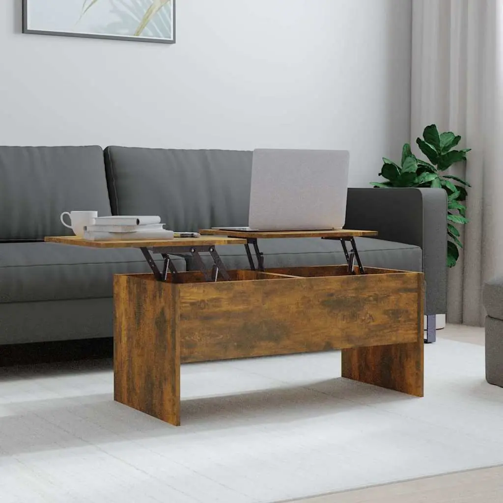 This coffee table is a prime example of modern style and practicality, making it a fantastic focal point for your living room while sprucing up your décor. With its eye-catching smoked oak finish, it beautifully blends form and function, perfect for coffee, reading, or showing off your favorite books and decor. Ample Storage: This table has two hidden drawers, perfect for stashing away remotes, coasters, or magazines to keep your living space tidy.Adjustable Height: You can easily change the height for different activities.Stylish Design: It's got a modern and sleek look that fits right into any room.Durable Material: Made from engineered wood, it's built to last.Easy Care: You can keep the surface nice and clean with just a dry cloth.