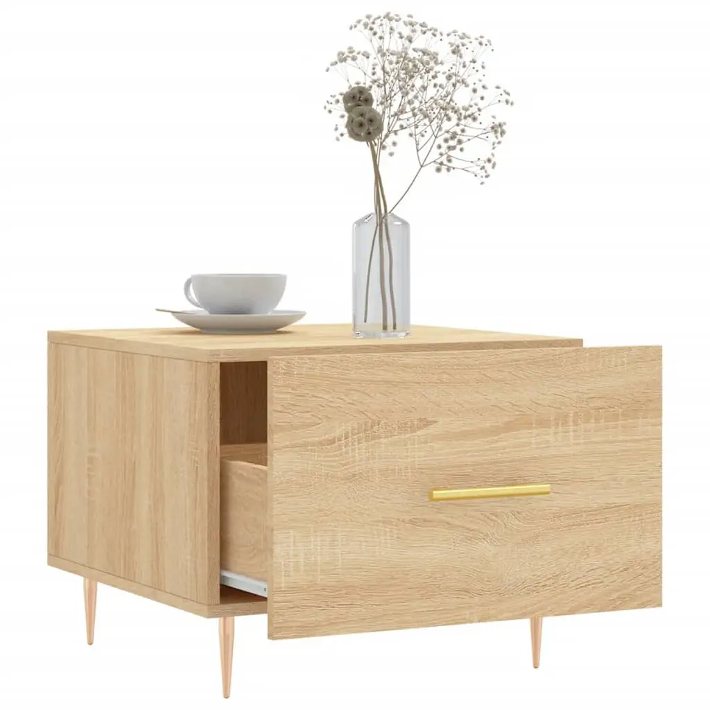 This coffee table with a drawer combines practicality with style, making it a must-have piece for any modern living space. Made from high-quality engineered wood and in a lovely Sonoma oak finish, it provides a warm and inviting vibe while being a functional focal point for coffee, reading, or socializing. Ample Storage: This coffee table has a spacious drawer to hide away magazines, remotes, and other small items, keeping your living room tidy. It combines functionality with elegant storage, making it a must-have in any room.Sturdy Construction: Built with a tough metal frame and engineered wood top, this table is made to handle daily use. Its durable materials ensure you’ll enjoy this stylish piece for years.Contemporary Style: The sleek matte finish and tapered legs give it a modern yet classic look that fits well with many decor styles. Whether you’re going for minimalist or adding a bit of sophistication, this table stands out.Versatile Functionality: Great for different uses, this coffee table can double as a sofa or side table, perfect for casual coffee breaks or more formal gatherings. Its stylish design makes it comfy to use in all sorts of settings, from a cozy lounge to a home office.Compact Size: At 19.7 in long, 19.7 in wide, and 15.7 in high, this coffee table is just right for medium living areas. It offers plenty of space for drinks while keeping a low profile.