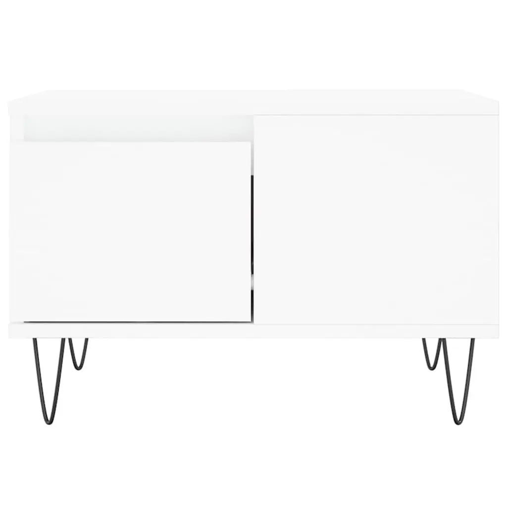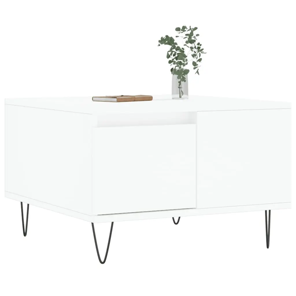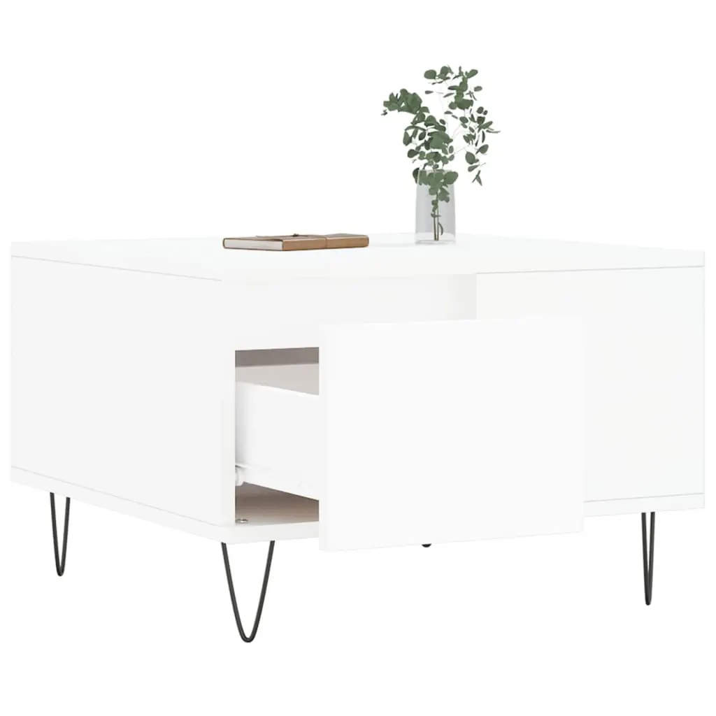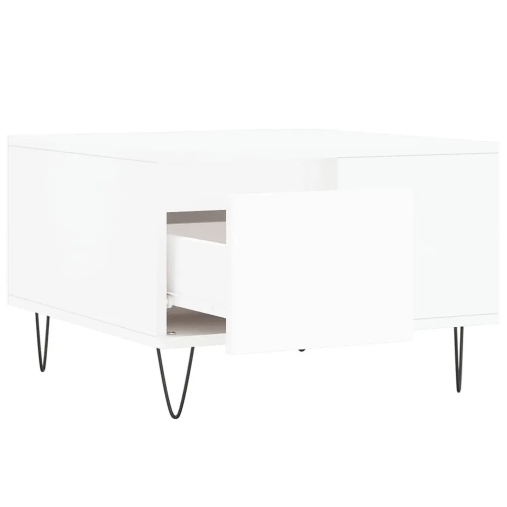 This coffee table brings a sleek vibe to any living room with its clean white look and modern square shape. It's super handy for serving coffee, displaying magazines, or setting down snacks during your get-togethers, making it perfect for both chill nights in or special occasions. Ample Storage: The single drawer’s perfect for keeping coasters, remotes, and other bits handy, so your living area stays neat and tidy.Durability: Built from tough engineered wood with solid chrome legs, this coffee table is designed to last through daily use while looking great.Chic Aesthetic: The matte white finish gives a clean look, plus it's non-reflective and easy on the eyes, fitting in with various decor styles nicely.Versatile Use: Great for serving coffee, it slides right into living rooms or lounges, perfect for both social gatherings and cozy nights in with a book.Compact Dimensions: At 21.7 in in width and length and 14.4 in in height, it fits snugly in smaller spaces while offering a good surface area for drinks and snacks.