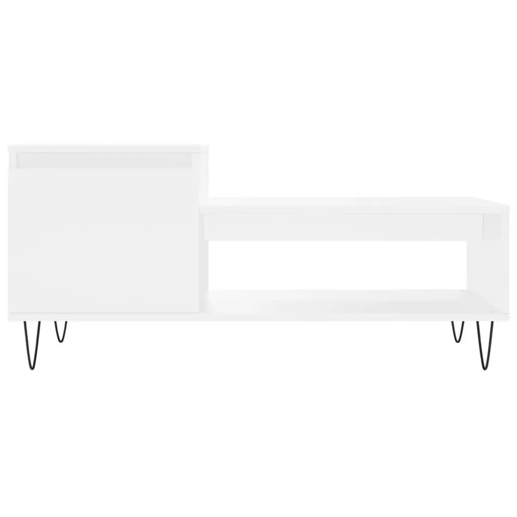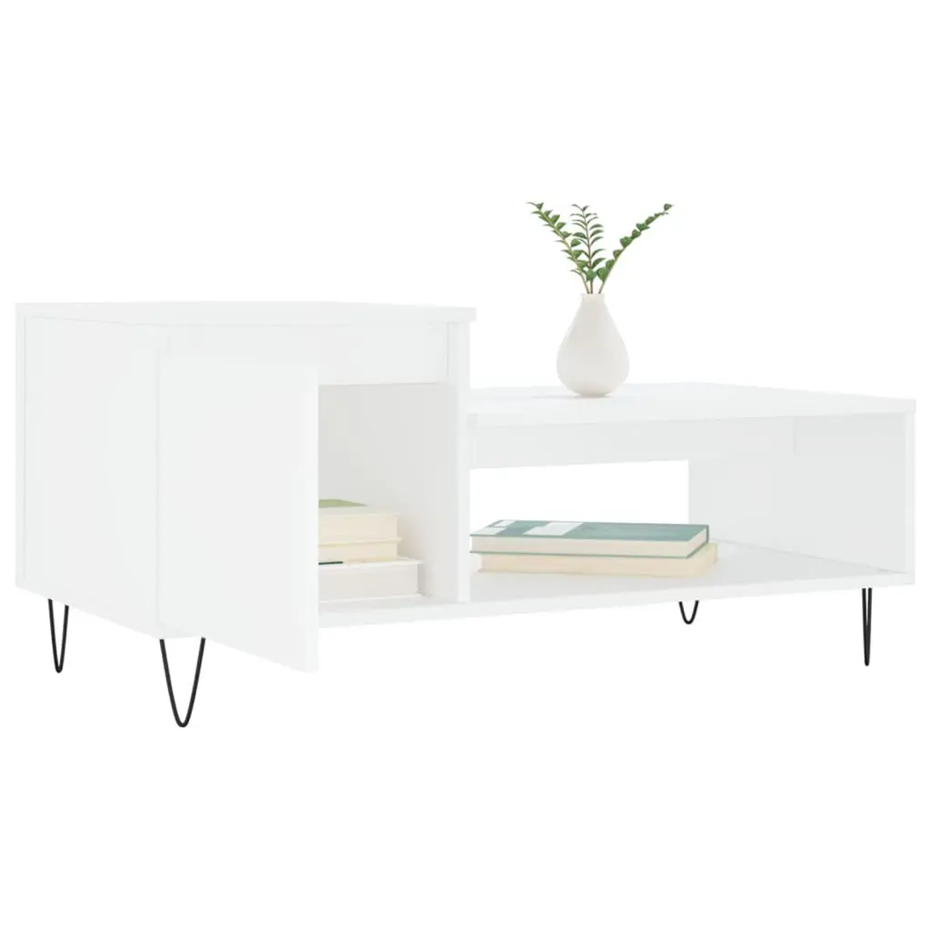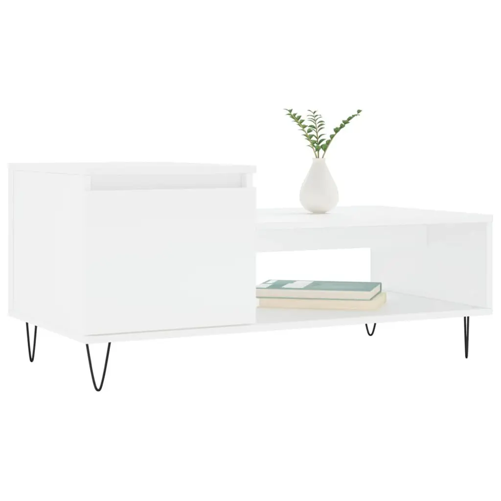 This coffee table is a stunning addition to your living space. With a modern design, it's your new go-to piece that combines style and function. The sleek lines and smooth white finish create a chill atmosphere, fitting seamlessly into any decor—whether you're going for minimalistic or contemporary. It's not just a table; it's a smart organizer that meets all your stylish and practical storage needs. Ample Storage: This coffee table has plenty of space to keep your magazines, remotes, and other essentials tidy, making your living room look neat and organized.Sleek Design: The modern glossy finish of the engineered wood gives an elegant touch and practical use that enhances the room while inviting relaxation.Durable Material: Sturdy engineered wood design means this table can handle daily use and keep looking great.Versatile Style: Perfect for various rooms like living rooms, bedrooms, or offices, this coffee table is great for coffee serving, workspace, or just as a decorative piece.Compact Dimensions: The table is 39.4 in long, 19.7 in wide, and 17.7 in high, making it great for medium spaces and giving you utility without crowding the area.