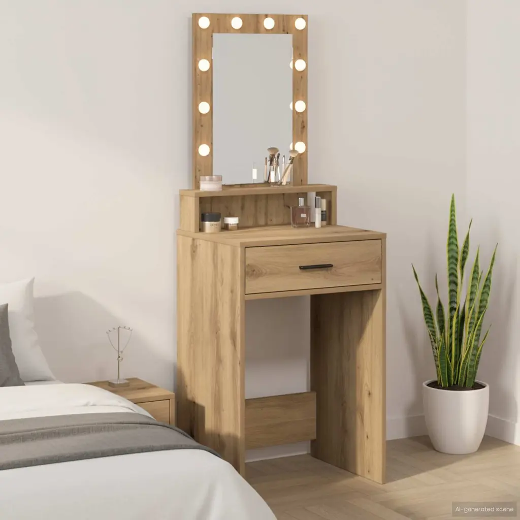 This modern dressing table blends style and function effortlessly—ideal for any contemporary bedroom. Made from top-notch engineered wood, it has a sleek and polished vibe, sturdy enough for today’s urban living. With its modern design, it fits right in with minimalist spaces while providing both elegance and practicality to match the latest home . Engineered Wood Construction This dressing table is all about engineered wood, which gives it a smooth look and ensures it's made to last. Easy to clean, it’s a great boost for your bedroom vibe.Integrated LED Lighting Get adjustable LED strip lights to make makeup and grooming a breeze at any hour. These LEDs save energy and add a dash of modern flair.Convenient Storage Drawers With engineered wood drawers, there’s loads of space for cosmetics, accessories, and bits and bobs. They glide open easily for quick access while keeping everything neat.Practical Plane Mirror The mirror offers a true reflection without any weird twists—great for when you're getting ready. Its simple design boosts the table’s usefulness while making the room feel lighter and bigger.Functional D-Pull Handles The D-Pull handles are comfy to grip, making it a doddle to open and close the drawers. This little touch ensures smooth use every day while looking good.