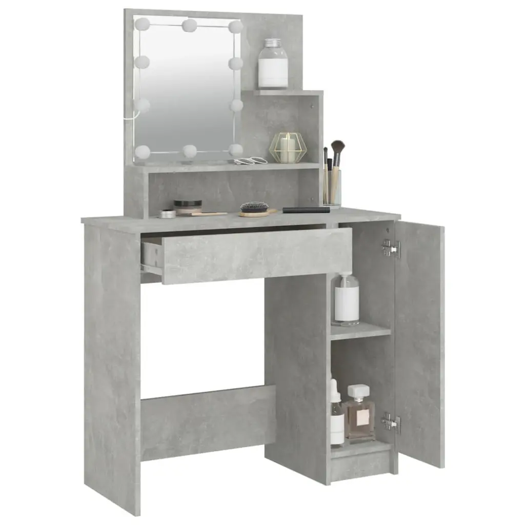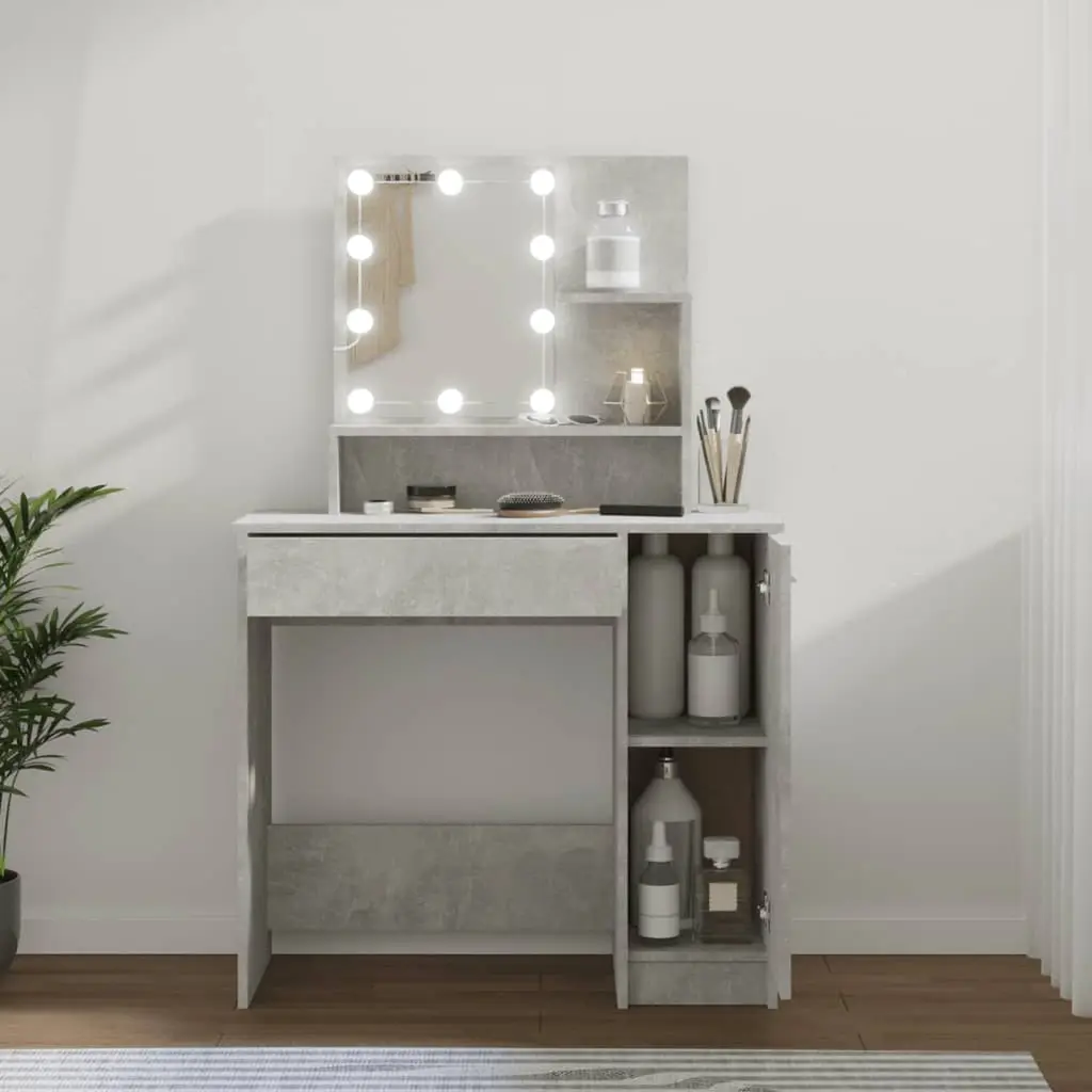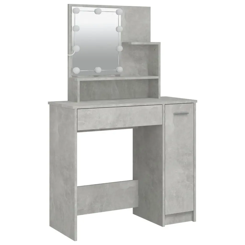 This modern dressing table adds a touch of elegance to any bedroom. It combines style and practicality perfectly, with a sleek rectangular shape and a smooth concrete grey finish that creates a welcoming spot for makeup and grooming. Everyday routines become a bit more luxurious. Built-in LED Lighting: Bright LED lights enhance your grooming routine, providing loads of light for makeup and styling. This feature makes it practical and comfy, great for those late-night touch-ups.Ample Storage: With a cabinet and two shelves, this dressing table offers a tidy spot for all your cosmetics and accessories. Everything stays organized and easy to find.Sleek Matte Finish: The understated concrete grey matte finish suits any bedroom decor while adding tactile elegance. It becomes a chic focal point in your grooming area, fitting in with various styles.Versatile Functionality: This modern dressing table’s tailored design is perfect for multiple tasks, from applying makeup to storing jewelry. It's designed for both efficiency and looks, making it spot-on for adults.Compact Dimensions: Measuring 34.1 in by 13.8 in by 53.5 in, this dressing table uses space well without crowding your room. Its compact design fits snugly in tighter areas. The product comes with a USB connector, but you won't find the certified 5V USB power source in the box.