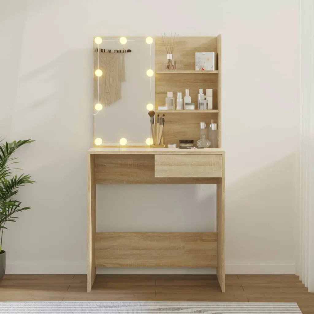 This dressing table is a well-crafted piece, combining functionality and style—perfect for beauty enthusiasts and everyday grooming. With its sleek Sonoma Oak finish and built-in LED lighting, it brings a contemporary feel, turning any bedroom into a chic vanity space where you can carry out your daily beauty routines with ease. Ample Storage: This dressing table has loads of room with three spacious drawers for storing makeup, jewelry, and other bits. It also comes with shelves for more goodies, keeping everything neat and tidy.Built-In Lighting: With LED lights, it’s perfect for seeing what you’re doing. A handy touch switch makes it easy to control the lighting for a seamless beauty routine.Elegant Design: The modern design and gorgeous Sonoma Oak color elevate your space. Its sleek texture and finish make it an eye-catching piece that matches various décors.Durable Material: Built from engineered wood, this dressing table is made to last, resisting moisture and daily wear. It has a matte finish to avoid any annoying glare.Optimal Size: Just right for small to medium rooms, the table offers a generous 29.3 x 15.7 in surface for all your beauty tools while being compact enough for tight spaces.