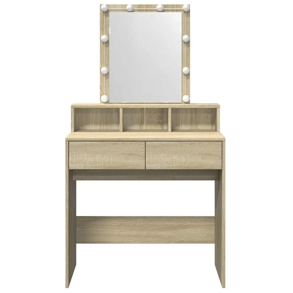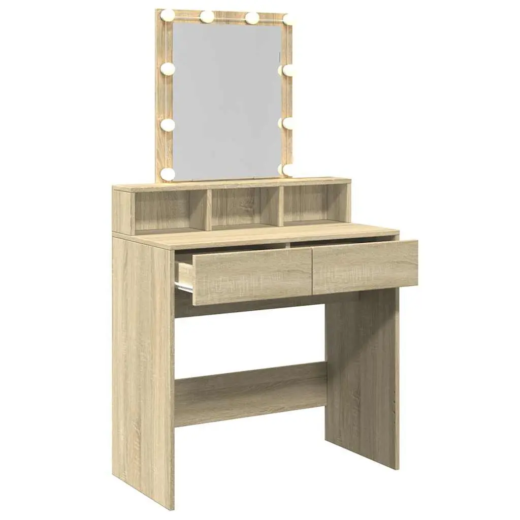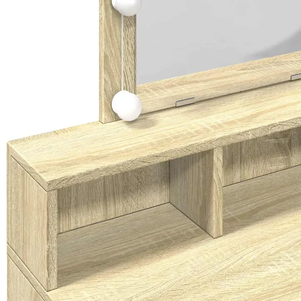 This dressing table, elegantly crafted in Sonoma oak, lifts your bedroom vibe with its modern charm and handy features. The mix of engineered wood and glass makes for a stunning piece that's just as practical, giving you a fab spot for your daily grooming while keeping everything neatly stored away. Modern Aesthetic: The lovely Sonoma oak finish brings a natural, warm vibe that fits in with various interior styles, making it a standout in your home decor. This dressing table isn't just a functional piece; it also boosts the overall feel of your bedroom.Integrated LED Lights: Fitted with Hollywood-style lights, this table lets you choose between warm and cool white options for the ideal glow when you're grooming, applying makeup, or getting ready late at night.Flexible Storage Solutions: With five compartments, including two standard drawers, this dressing table gives you plenty of space for makeup, jewelry, and other essentials, making your grooming routine smooth and organized.Sturdy and Reliable: Made from high-quality engineered wood, this table is durable and has a smooth finish that stands up to daily wear while keeping its style for years to come.Space-Saving Design: The compact size of 31.5 in long, 16.1 in wide, and 56.9 in high ensures that this piece fits perfectly in your bedroom without taking over the space, giving you a designated spot for all your vanity needs.