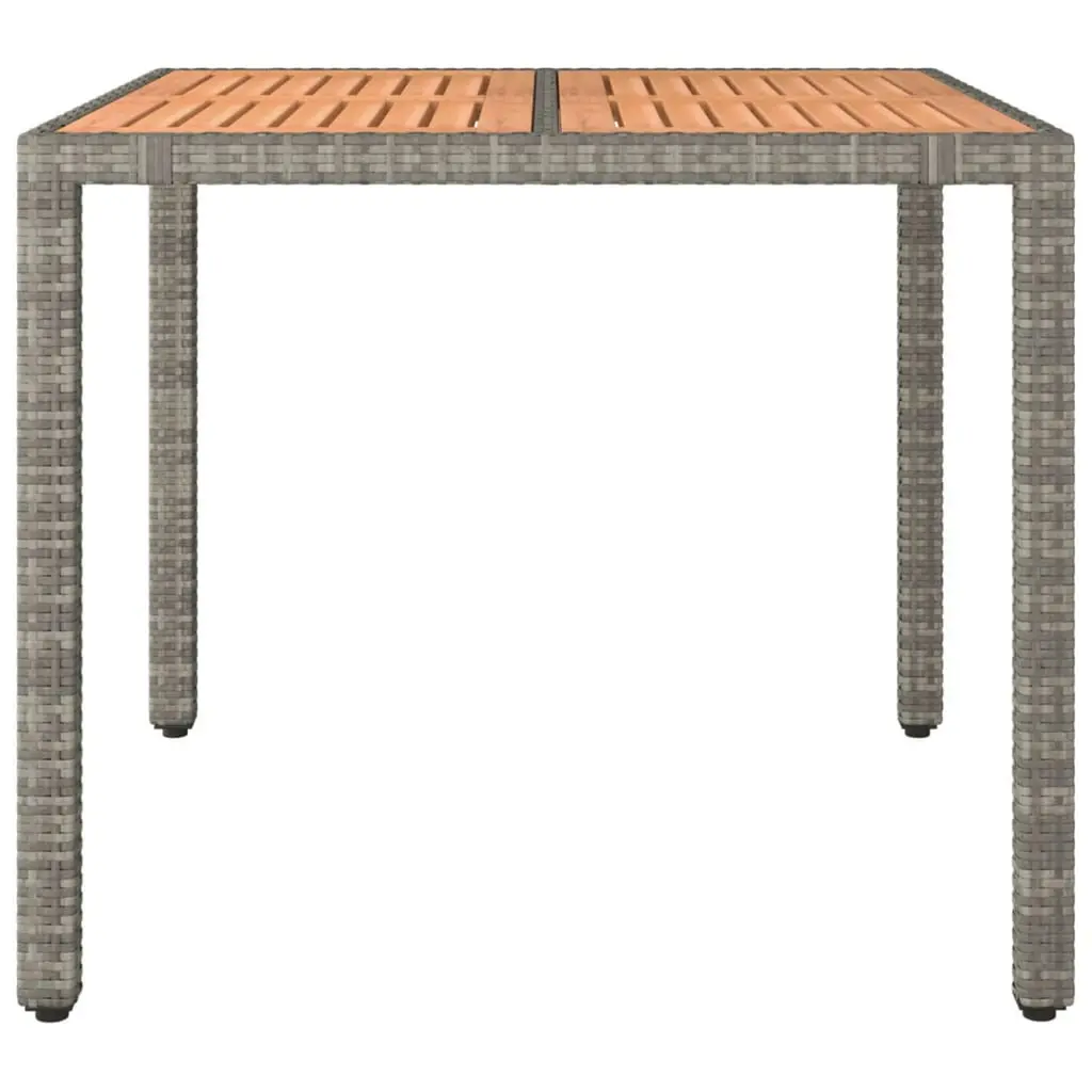 This garden table with a wooden top merges functionality with modern style, ideal for any outdoor area. Its smooth surface and solid acacia wood design boost its looks and usability, making it a great spot for friends and family during pleasant spring and summer evenings. Each table is made using durable poly rattan, ensuring it lasts even in tricky weather.The roomy surface is designed to hold up to four people, perfect for meals outside.With an oiled finish, the wooden top shows off its natural beauty while adding extra protection against damp.The sturdy steel frame and square legs provide solid support and enhance the modern look.Cleaning is easy, letting you enjoy your outdoor areas without the hassle of upkeep.