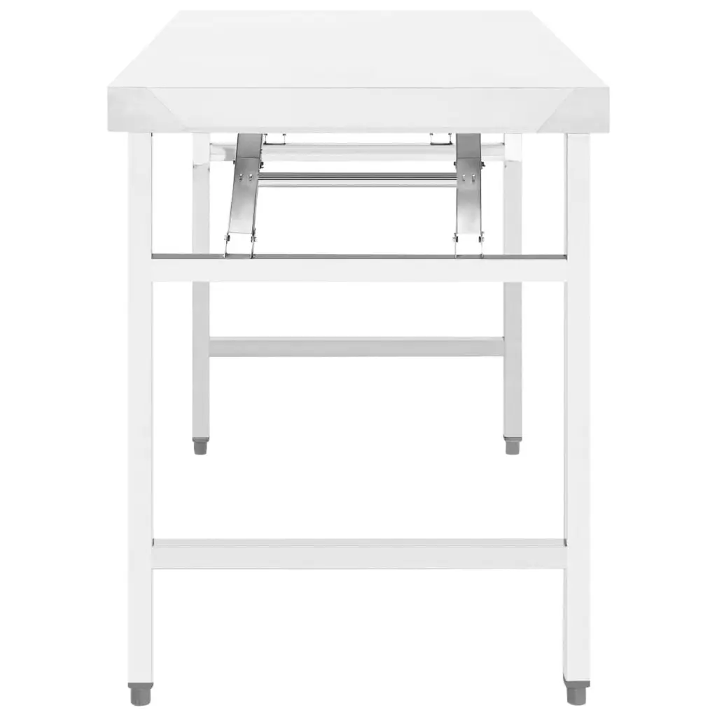 This foldable work table is perfect for food preparation and service and is ideal for a kitchen bar, restaurant, school, and other commercial space.This gastronomy worktable, made of stainless steel, is strong and stable for years. Its reinforced tabletop with high load capacity is ideal for placing kitchen tools, food and other essentials. The table is also easy to clean with a damp cloth. Thanks to its foldable design, this workbench can be set up and folded easily to save space when not in use.