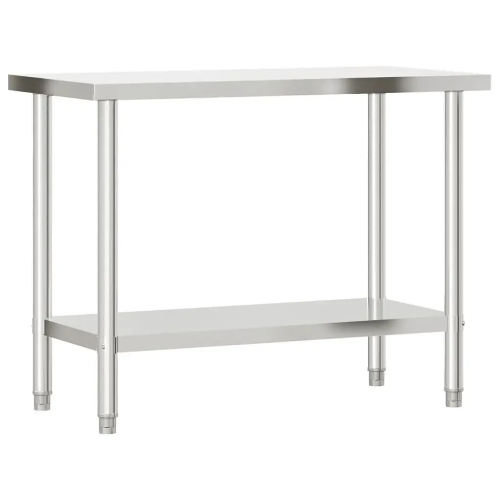 This kitchen work table is perfect for food prep and storage and is ideal for a kitchen bar, restaurant, school, as well as other commercial places.Durable and stable construction: The work table is made of stainless steel for years of reliable use. The smooth surface is easy to clean and maintain, ensuring a hygienic food preparation area.Ample workplace: The stainless steel prep table is designed with a bottom shelf and a 2-tier overshelf for customized storage space, providing ample storage space for your microwave oven, kitchen utensils, or any other tools you may need.Adjustable feet: The adjustable feet with a non-slip design ensure the kitchen prep table remains stable and will stay put, protecting the floor from damage.Warning:To prevent it from tipping over, this product must be used with the provided wall attachment device.