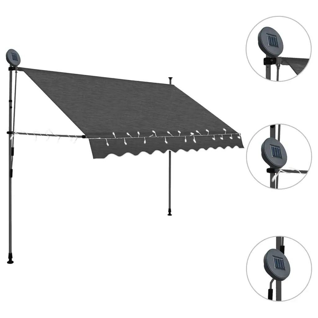 This manual retractable awning is here to spice up your outdoor experience with adjustable shade and lights. Whether you're looking to soak up the rays or keep cool from the heat, this stylish and handy awning is just the ticket for balconies, terraces, and gardens, featuring a smooth, modern charcoal finish that fits right in with any outdoor vibe. Adjustable Features: This awning's manual crank lets you adjust the height and how far it rolls out for top-notch shade on sunny days.Integrated Lighting: Fitted with solar-powered LED lights, the awning not only blocks the sun but also brightens up your outdoor space at night, perfect for gatherings under the stars.Modern Design: With its sleek charcoal color, this awning adds a touch of class to your outdoor areas, making it a nice fit for your home.Robust Material: Made from tough polyester with a PU coating, this awning is UV and water-resistant, providing great longevity and protection from the elements.Versatile Usage: Perfect for all sorts of outdoor settings, this retractable awning fits like a glove on your balcony, is fab for barbecues on the terrace, or creates a comfy nook in your garden.