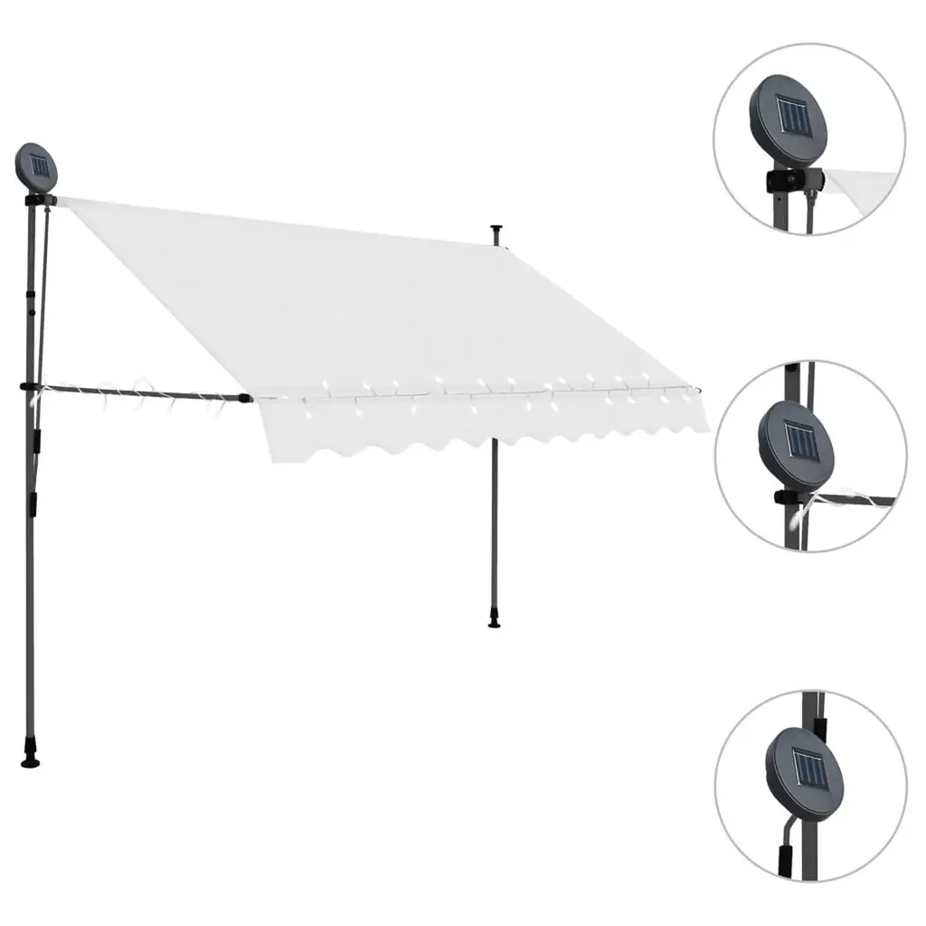 This manual retractable awning is a top pick to jazz up any outdoor area, offering crucial shade and style for terraces, balconies, or gardens. Made from sturdy materials, it sports a chic cream look alongside energy-efficient LED strip lights, boosting its flair and practicality, perfect for gatherings or chill evenings under the stars. Customizable Shade: With adjustable height and retractable features, this awning lets you easily create your ideal outdoor space, giving you sun protection when you need it while keeping your view clear.Energy Efficient LED Lighting: The solar-powered LED strip offers a warm, soft light, making evening gatherings more enjoyable while showing off your chic outdoor area.Durability at Its Core: Made with UV and water-resistant materials, this awning withstands the elements, letting you enjoy your outdoor space worry-free.Versatile Use: Great for all sorts of places like balconies, terraces, and gardens; this awning suits different lifestyles and preferences, adding comfort and style to any outdoor get-together.Dimensions and Care: At a generous 118.1 in wide, it’s big enough to give you plenty of shade. Maintenance is a breeze, with simple cleaning methods to keep it looking fresh and inviting.