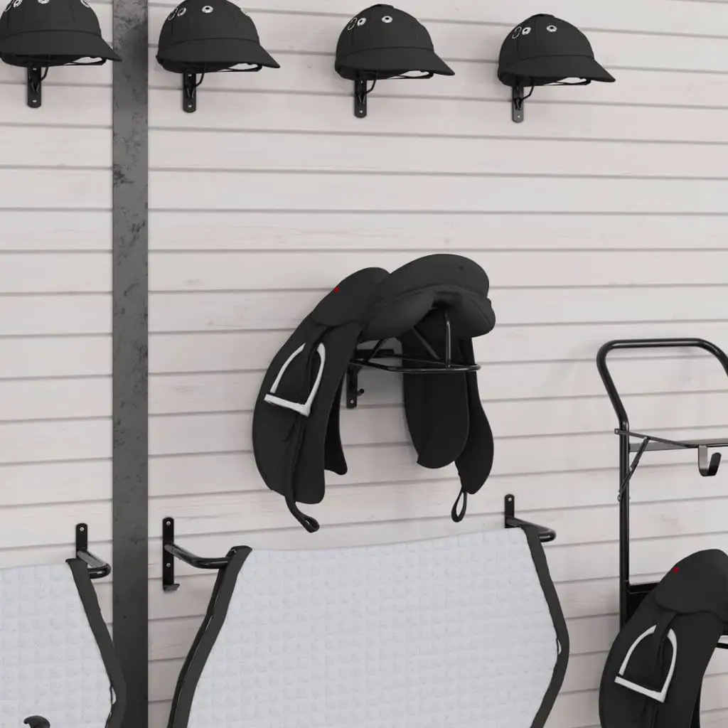 This Portable Wall-Mounted Saddle Rack is the ideal way to keep your riding gear both organized and within easy reach. It's got a smart design that works well in any tack room, garage, or stable setup. The snazzy black finish and smooth surface make it look great, while it’s tough enough to hold up to regular use, especially if you've got strong animals or outdoor elements at play. Durable Construction: This saddle rack is made from powder-coated iron, ensuring it's built to handle everyday use indoors or out. The strong materials support the weight of saddles and other gear with ease.Easy Assembly: It’s a breeze to put together—just grab a screwdriver and get going! Plus, it’s just as easy to take apart if you need to move it.Space-Saving Design: The wall-mounted style makes the most of your storage, keeping your gear organized and off the floor. By using your wall space, you’ve got more room to move around and store other bits and bobs.Versatile Usage: Great for tack rooms, barns, or stables, this saddle rack can organize saddles, bridle hooks, and more. It's perfect for all riders, whether you’re a pro or just starting out.Stylish Appearance: With its industrial style and sleek black finish, this saddle rack not only does the job but also looks good in any space, fitting in nicely with any decor.