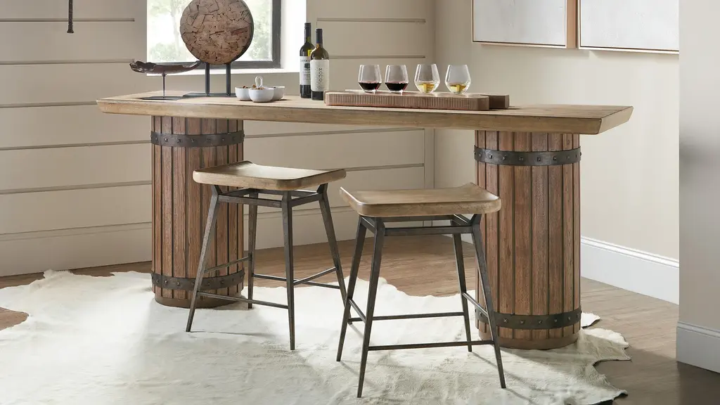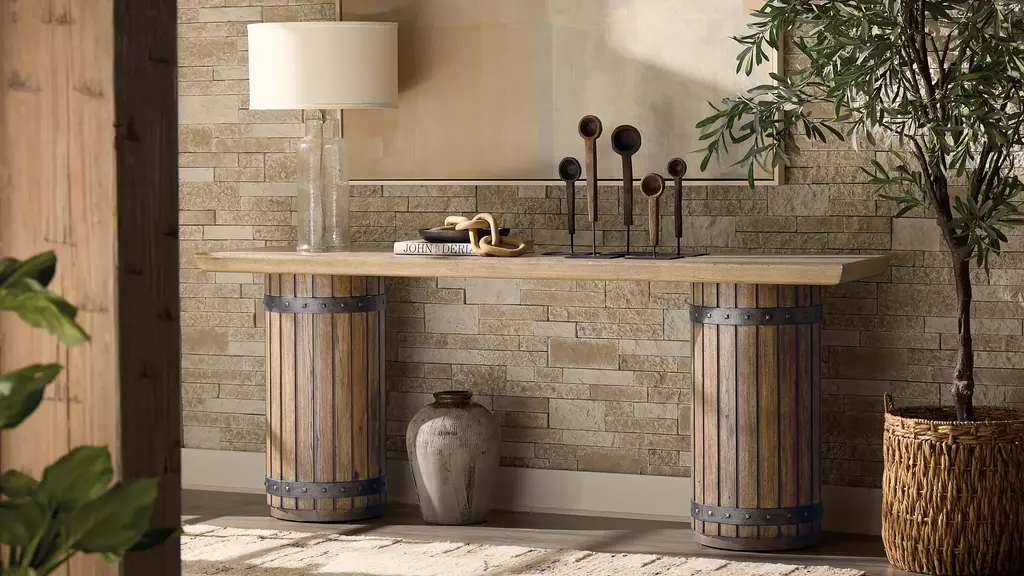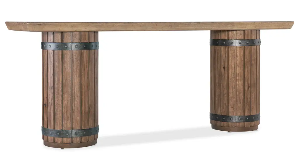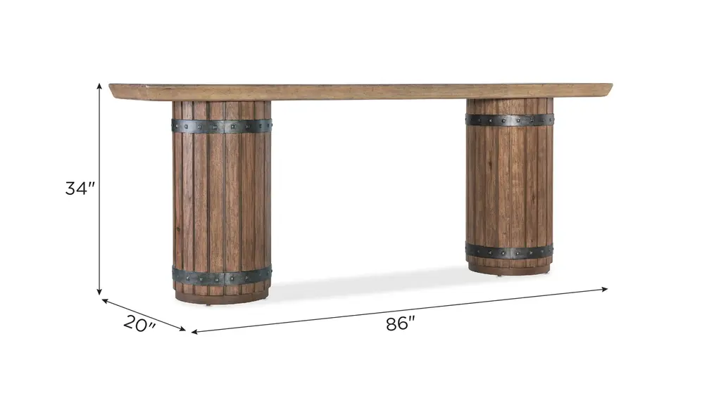 Capture the essence of the Napa Valley lifestyle with the Vineyard Row Console Table. Measuring 86 inches wide by 20 inches deep, the table has rustic wine barrel-influenced pedestal bases and hammered metal accents. Crafted of Pecky Hickory Veneers with resin, the top is finished in the light and airy Sonoma tone, and the base is in Napa, a darker tone inspired by the red wines of the Napa Valley