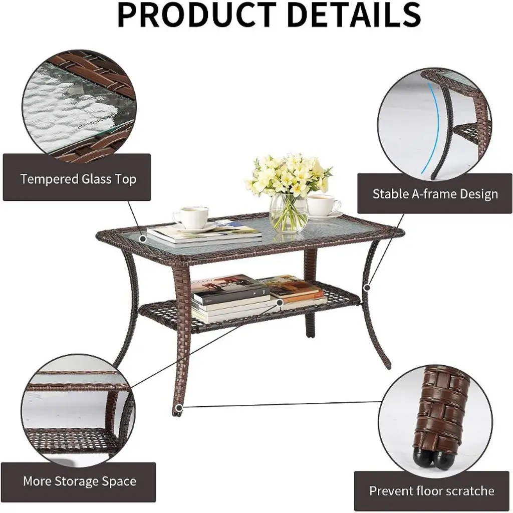 This wicker outdoor Coffee table combines sleek modern design with practicality. The table features a sturdy wicker construction, ensuring durability and longevity. The tempered glass tabletop adds a touch of sophistication and is easy to clean, while the lower storage shelf provides ample space for your books, magazines, or other essentials. This Patio coffee table is not just a piece of furniture, but a style statement that will enhance any room. Specifications: 1. Material: PE Rattan, Iron, Tempered Glass 2. Overall Size: 39” x 22” x 20"(L x W x H) 3. Storage Space Height: 10.04in 4. Load Bearing: 110 lbs
