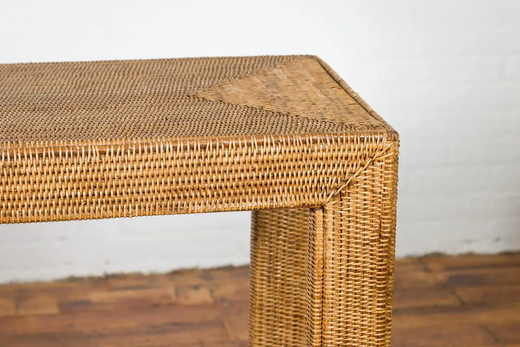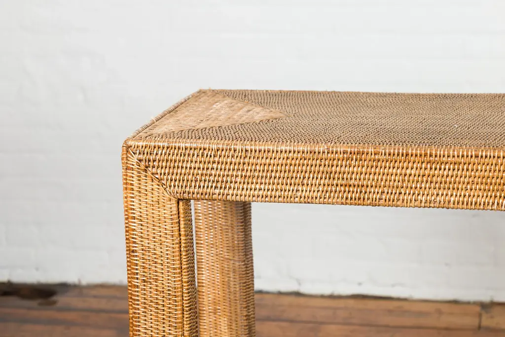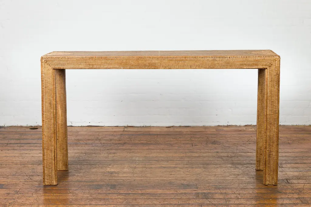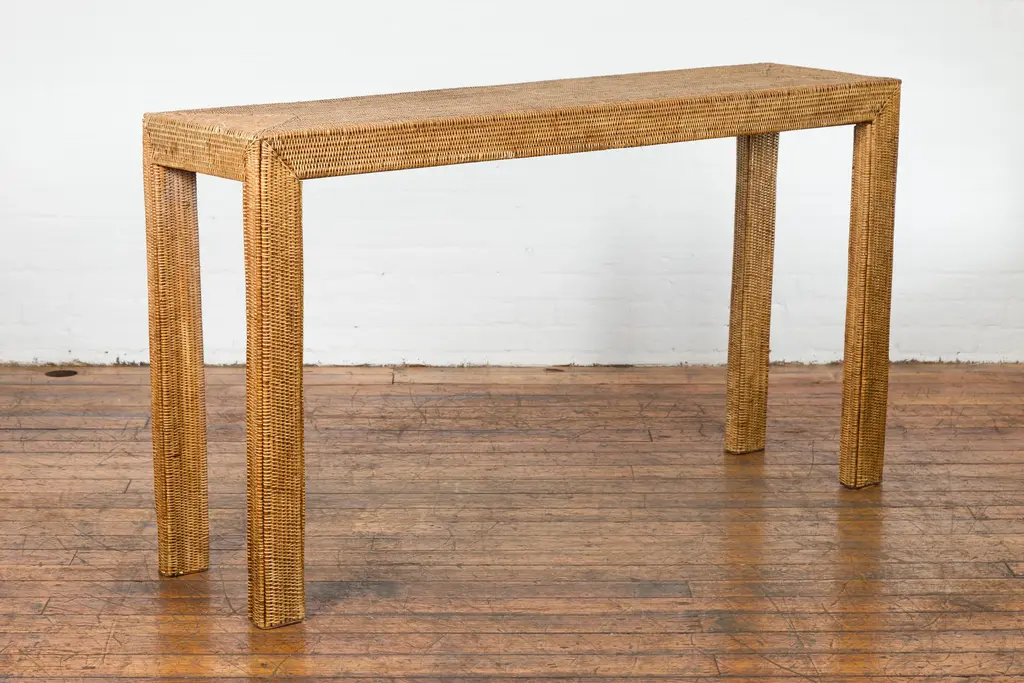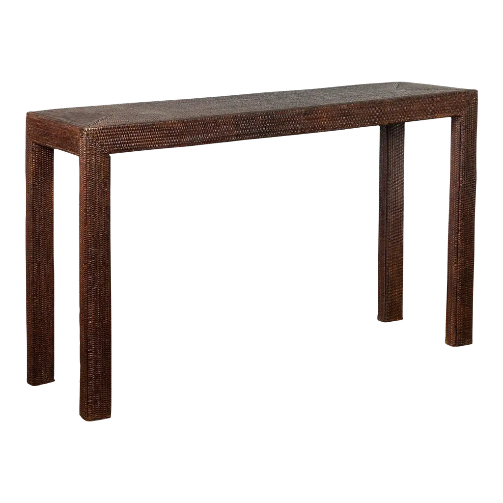 A vintage Thai Country style woven rattan console table from the Mid-20th Century, with straight legs and triangular patterns. Add a touch of vintage charm to your home with this delightful vintage Thai Country style woven rattan console table from the mid-20th century. Originating from Thailand during the midcentury period, this console table showcases a simple yet captivating design that exudes rustic character. Crafted with meticulous attention to detail, this console table features a narrow rectangular top adorned with triangular patterns on the sides. The woven rattan surface adds an element of natural texture and visual interest, making it a perfect addition to coastal homes or mountain cabins. Supported by four straight legs, this console table offers both stability and style. Its clean lines and timeless design make it a versatile piece that can effortlessly complement a variety of interior styles, from rustic farmhouse to eclectic bohemian. We offer two height options for this console table to suit your specific needs. Choose between the dimensions of 59"W x 16"D x 33"H or 60"W x 16"D x 34"H, ensuring a perfect fit for your space. Embrace the allure of vintage craftsmanship and add a touch of authenticity to your home decor with this vintage Thai Country style woven rattan console table. Its timeless appeal and unique character will make it a focal point in any room.
