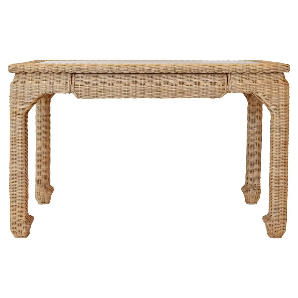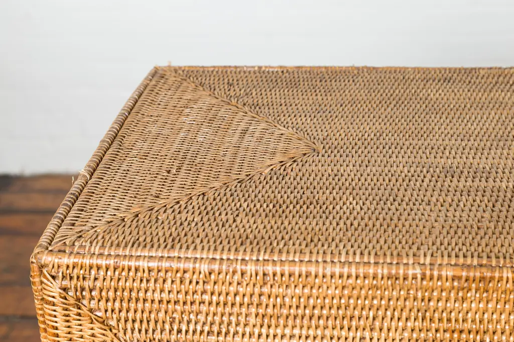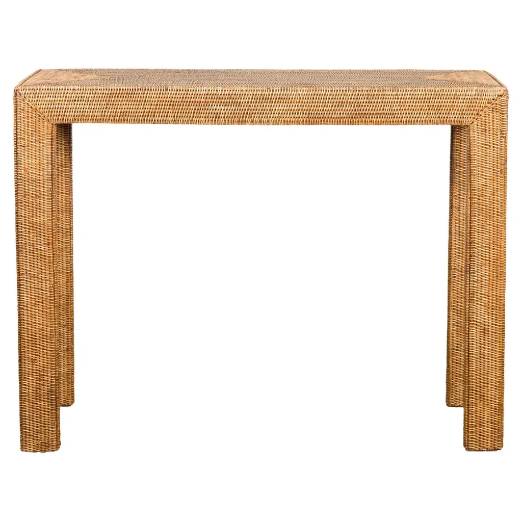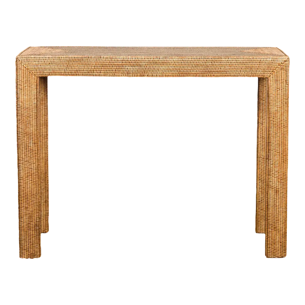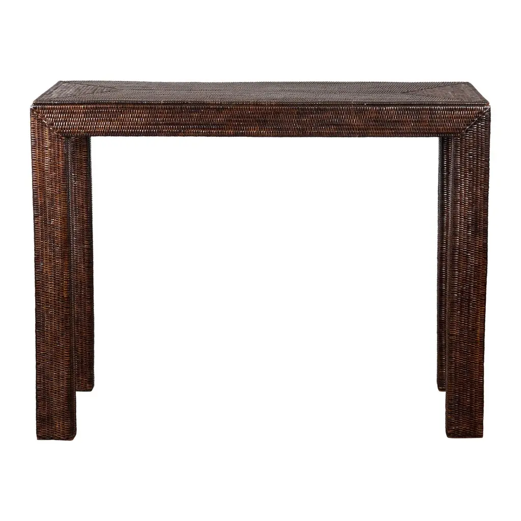 A vintage Thai Country style woven rattan console table from the Mid-20th Century, with straight legs and triangular patterns. Add a touch of vintage charm to your home with this delightful vintage Thai Country style woven rattan console table from the mid-20th century. Originating from Thailand during the midcentury period, this console table showcases a simple yet captivating design that exudes rustic character. Crafted with meticulous attention to detail, this console table features a narrow rectangular top adorned with triangular patterns on the sides. The woven rattan surface adds an element of natural texture and visual interest, making it a perfect addition to coastal homes or mountain cabins. Supported by four straight legs, this console table offers both stability and style. Its clean lines and timeless design make it a versatile piece that can effortlessly complement a variety of interior styles, from rustic farmhouse to eclectic bohemian. We offer two height options for this console table to suit your specific needs. Choose between the dimensions of 59"W x 16"D x 33"H or 60"W x 16"D x 34"H, ensuring a perfect fit for your space. Embrace the allure of vintage craftsmanship and add a touch of authenticity to your home decor with this vintage Thai Country style woven rattan console table. Its timeless appeal and unique character will make it a focal point in any room.