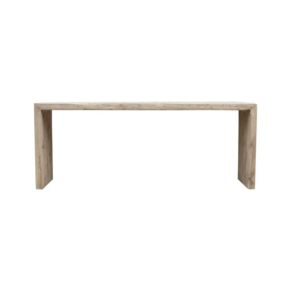 This extra-long vintage console table features a fluid waterfall silhouette, hand-shaped from weathered wood with a warm, natural patina. Its seamless curve and generous length give it a quiet elegance that pairs beautifully with both rustic and contemporary interiors. Each piece is crafted from solid reclaimed wood, then softened by decades of use. Expect natural splits, grain variation, and surface texture that reflect its age and origin. No two are exactly alike—each one carries its own story in the lines and knots of the wood. Approximate Dimensions: W 100″ × D 16″ × H 34″ Use it as an entry table, behind a sofa, or along a gallery wall. It offers a long, grounding presence with sculptural simplicity.