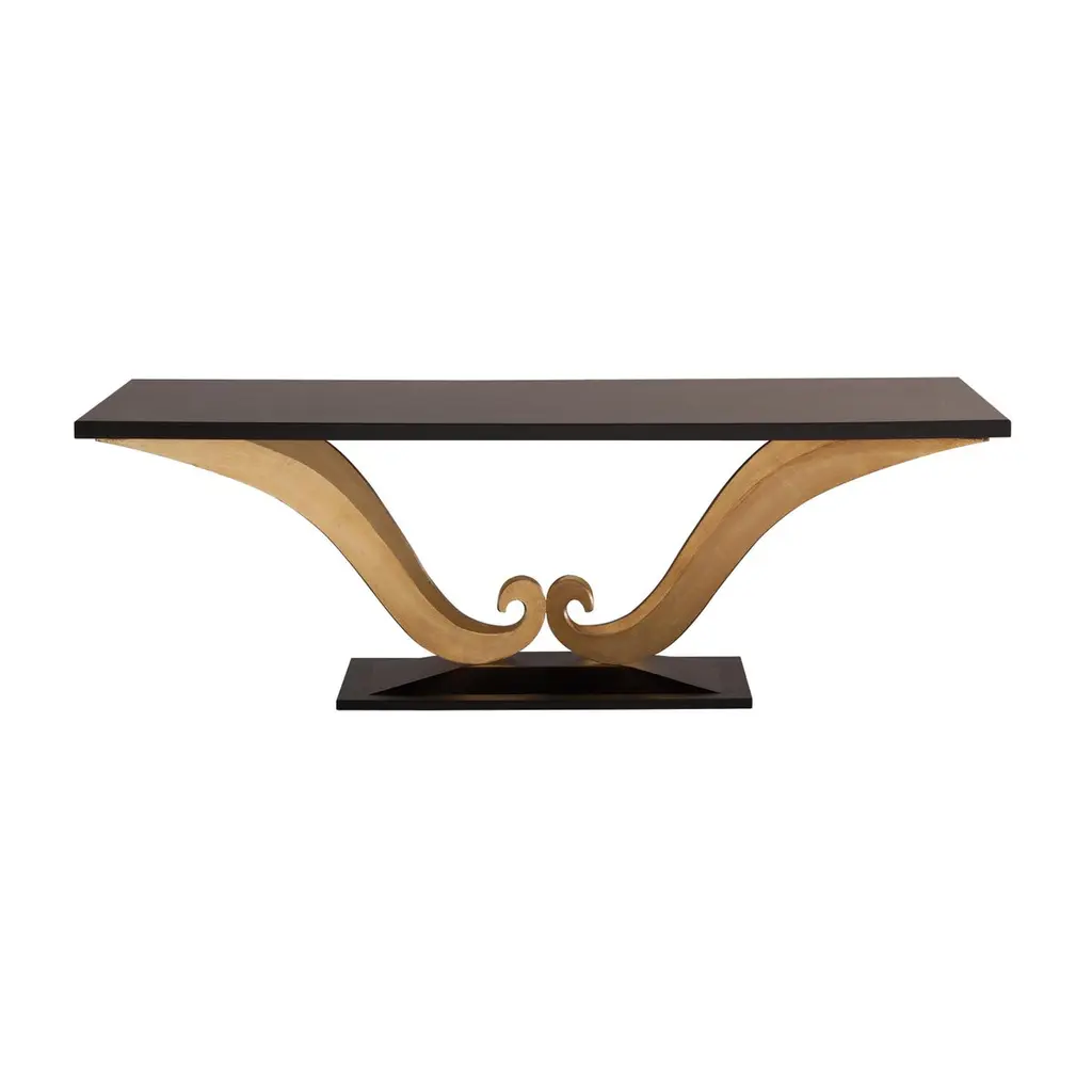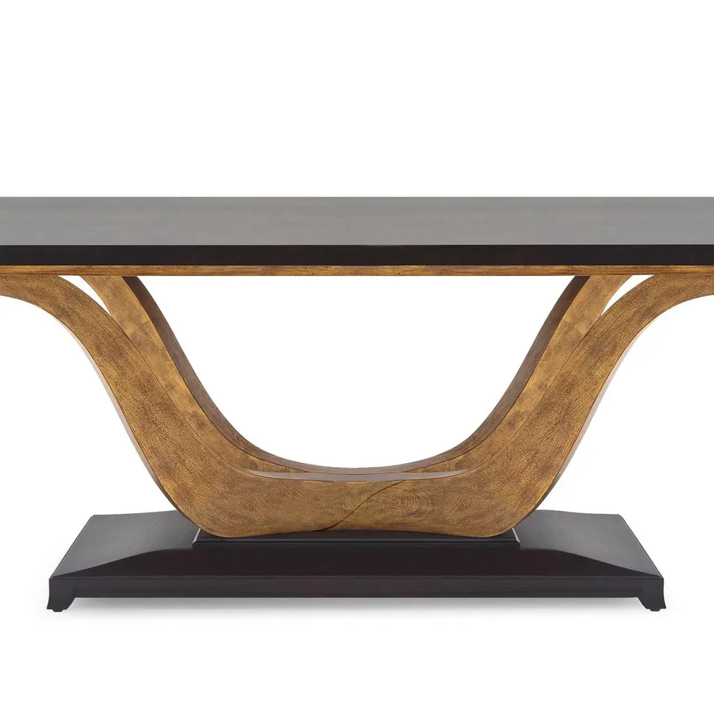 Dinning Table Virginia with structure in solid mahogany woodwith veneered table top. Base in solid mahogany wood, hand-painted with gold painting in antique fiinish.Also available in L214 or 183 cm, on request.