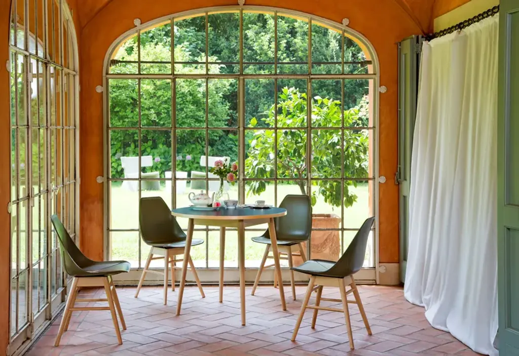 Virna is a large and versatile family of tables with different dimensions and heights. The structure recalls the design that defines this collection: four beech wood legs, with round section, turned and down tapered are joined in the upper part to assure a perfect stability. The frame, available in 75 and 105 cm height, is conceived as an element able to adapt itself to all the top typologies proposed by Alma and allows a great customization. Virna can easily furnish a living space or in bars, restaurants and office spaces, Virna table collection can support different shapes and dimensions' tops.