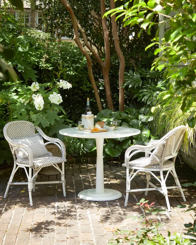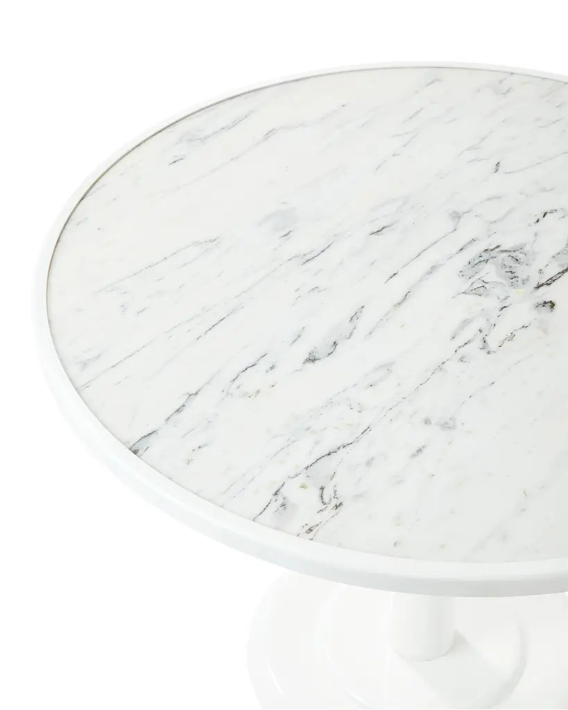 A petite footprint perfect for banquettes and nooks. Influenced by the iconic tulip tables of the 1950s, with a round marble top and powdercoated aluminum base.