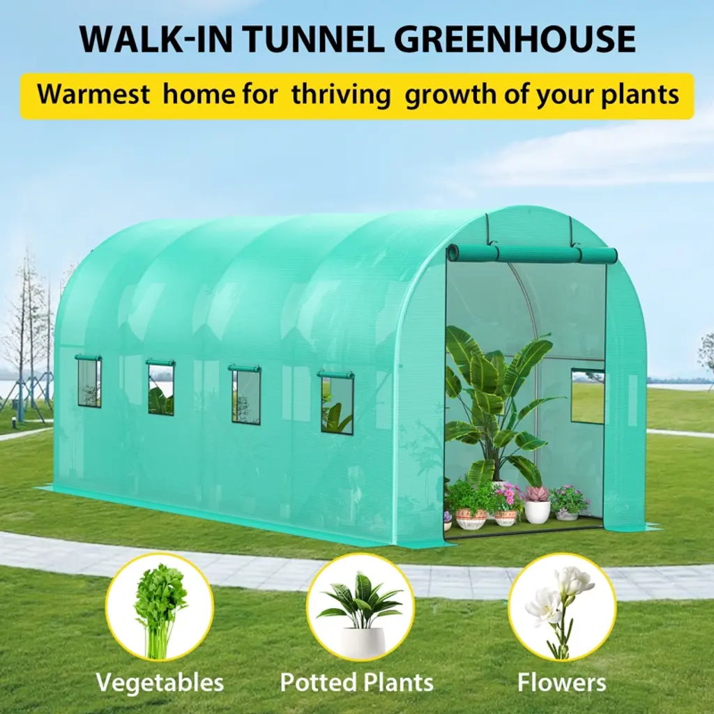 Our walk - in tunnel greenhouse is a top - notch choice for gardening enthusiasts, offering a range of high - quality features. The durable 140G green PE grid fabric cover provides excellent light transmission and insulation, effectively regulating internal temperatures to encourage plant growth, especially during winter months, making it ideal for winter gardening. Its robust galvanized pipe frame (19x0.6) ensures outstanding stability and long - lasting durability, with the galvanized construction preventing rust for use in various outdoor environments. The specially designed widthened bottom enhances stability and wind resistance, protecting plants from external weather impacts like bright sunshine or snowstorms. For ventilation and access, it has six mesh windows and a convenient zipper roll door that can be fully opened, improving air circulation, keeping pests out, and providing easy access. Additionally, it's easy to assemble with all necessary installation accessories included, such as white gloves, screws, a wrench, ground pegs, and guy ropes, requiring no professional skills and making it accessible to all.
