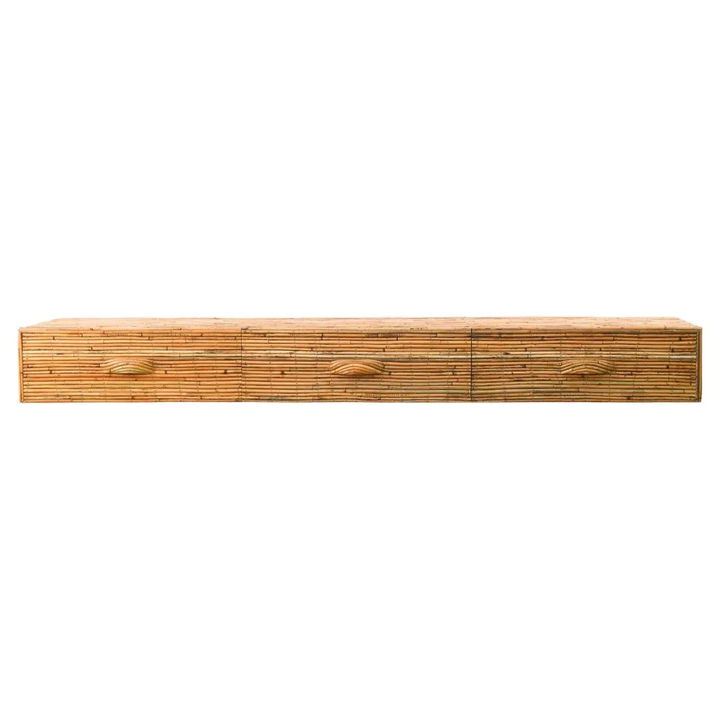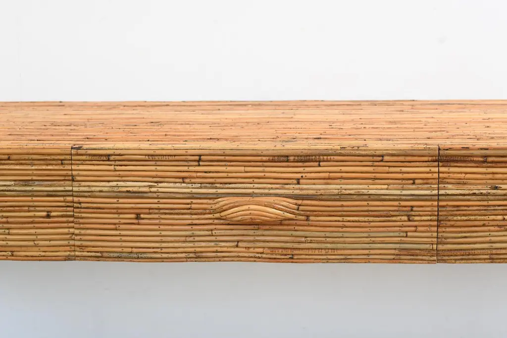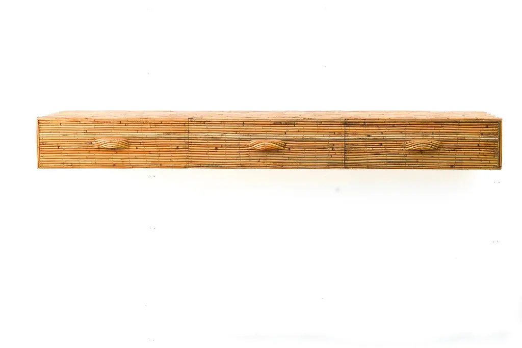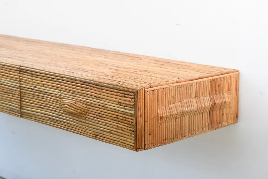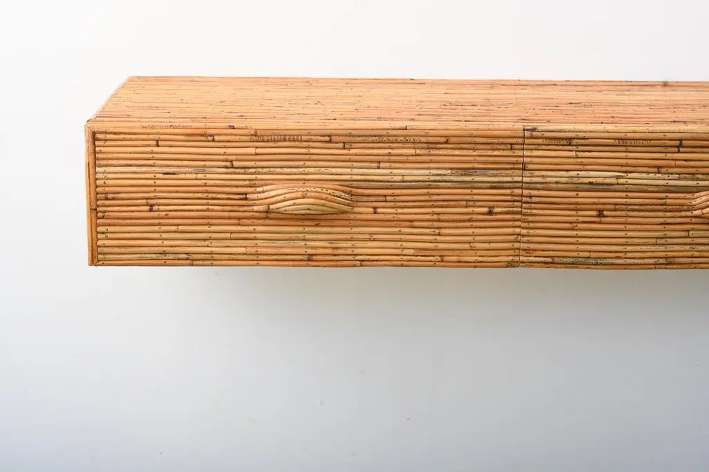 This wall mounted console table“Cardi” is crafted entirely from sustainably sourced organic rattan and cane has embodies earthy sophistication. Its rattan texture celebrates natural imperfections—each rattan piece tells a story of artisanal craftsmanship, creating a softly tactile surface that radiates warmth and organic charm. Thoughtfully designed with three smooth-gliding drawers, concealed behind a facade of intricately rattan inlay. The discreet integrated handles are masterfully bent into the material itself, ensuring the uninterrupted flow. - 100% organic rattan & cane, ethically harvested and handcrafted. -Three spacious drawers with handles that visually blend into the façade, preserving the table’s harmonious aesthetic. - Wall mounted console table-Perfect for entryways, living rooms, or as a serene bedroom accent. Complements bohemian, coastal, minimalist, and modern organic interiors. Dimensions: Height: 16cm Width: 148.5 cm Depth: 45.5 cm Drawer Depth: 36.5 cm (each)