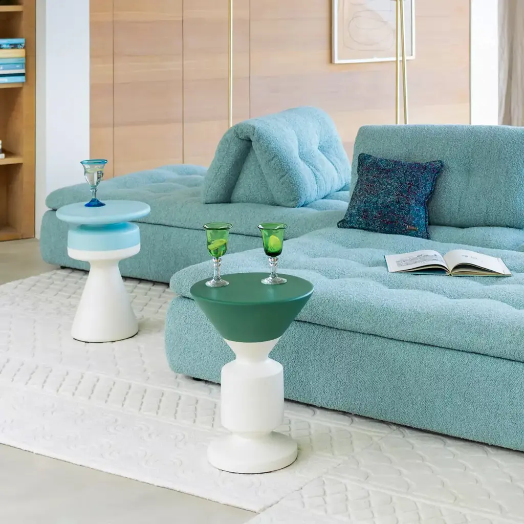 Inspired by fishing rod floats, the three Waterline side tables are like sisters in a cheerful family. Handcrafted in ceramic at an artisan workshop in Umbria, Italy, they require two glaze baths and a double firing process to achieve their distinctive contrast.