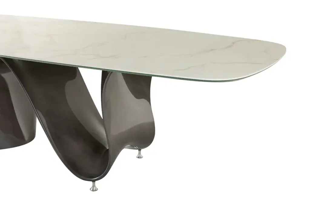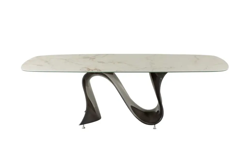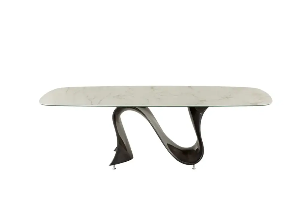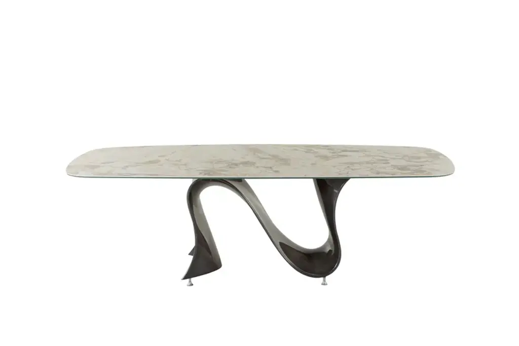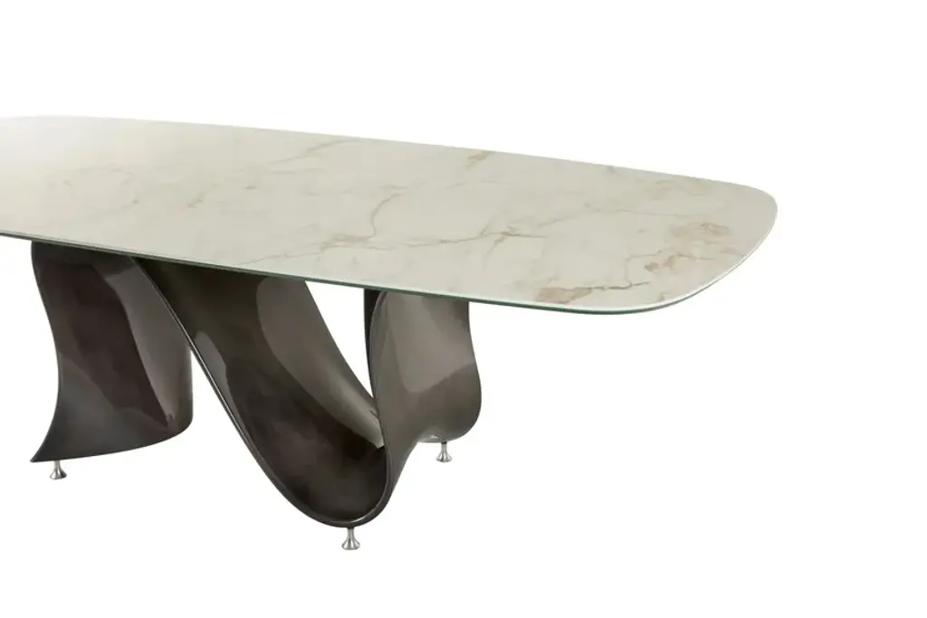 Wave is a fixed rectangular table with porcelain stoneware or ceramic glass top in various finishes, the top is available in the rectangular or shaped version, base in Baydur®.Ceramic glass top: black, dark brown, white.Porcelain stoneware top: onyx grey, statuario altissimo, Portoro, onyx amber, Emperador.Base: glossy white, glossy black, glossy beige, glossy champagne, corten (RAL colouring).Wave is the result of long and diverse techniques, based on how to work with different and innovative materials. We decided to use Baydur®, a material that allowed the base to perfectly imitate a wave’s strong movements. To counter-balance, the top was thought to look as static as possible, a line to appease and redefine the wave. It stars as pure movement; it ends as stasis.