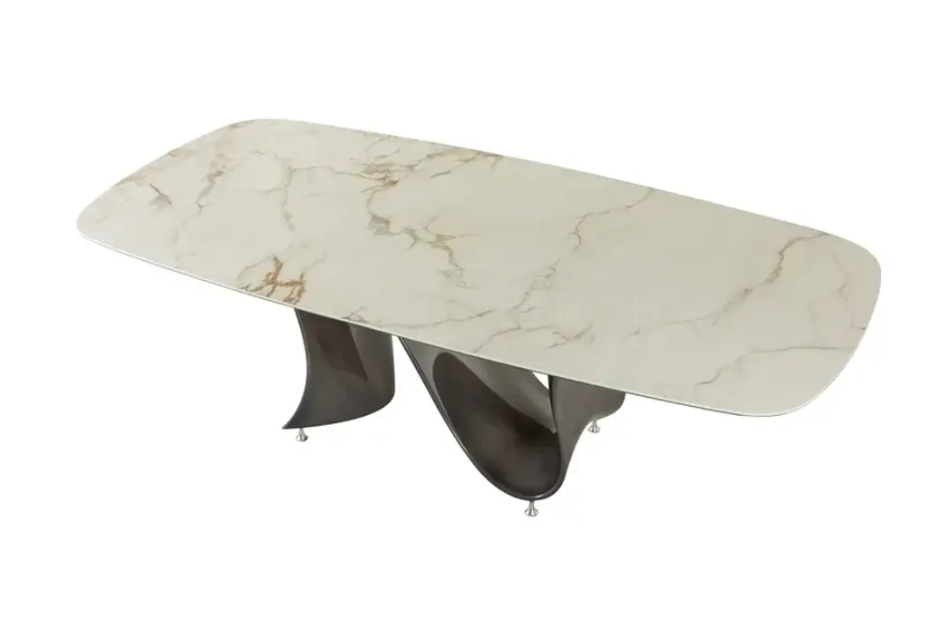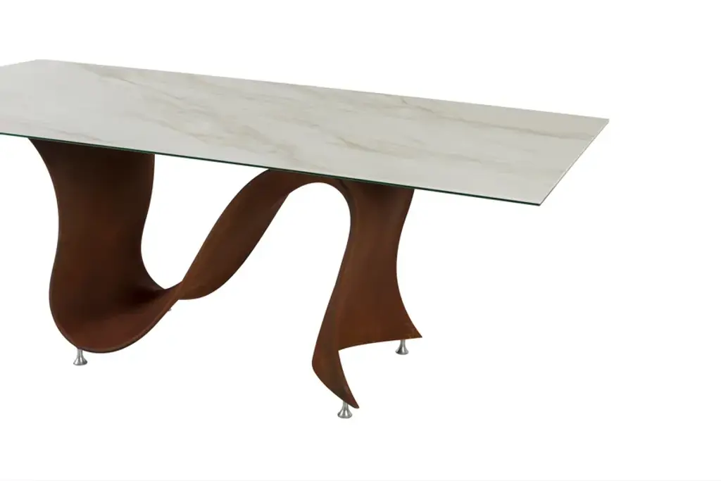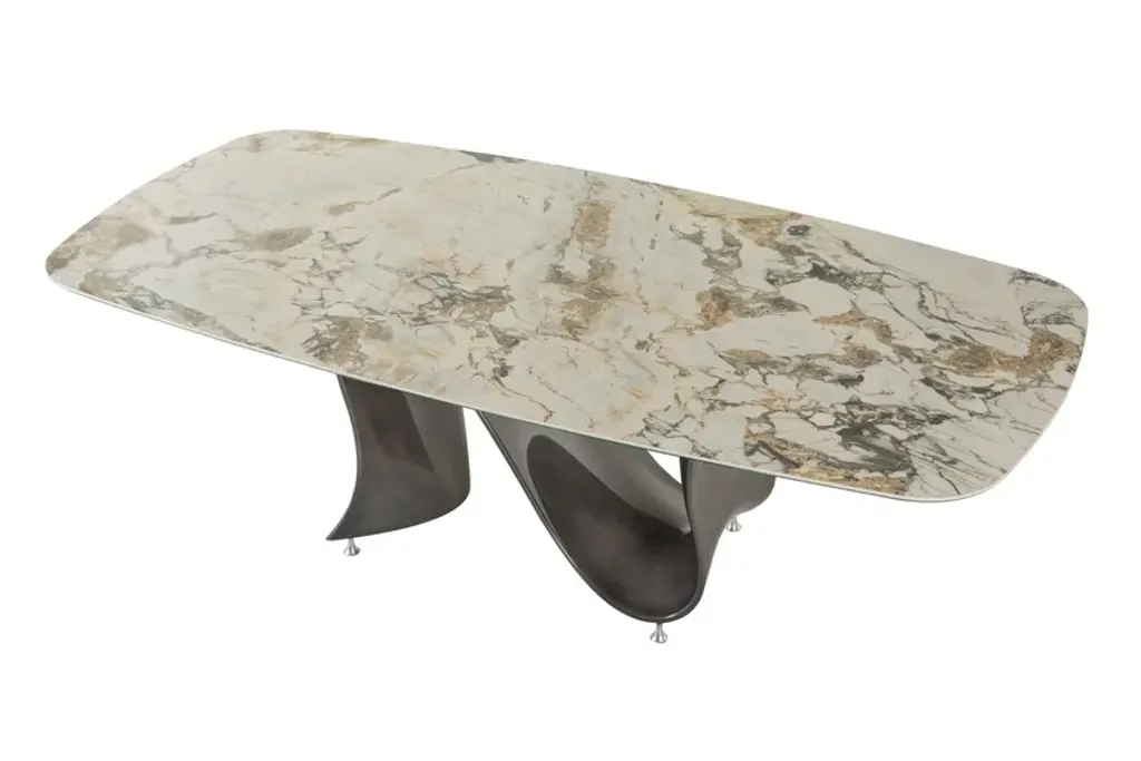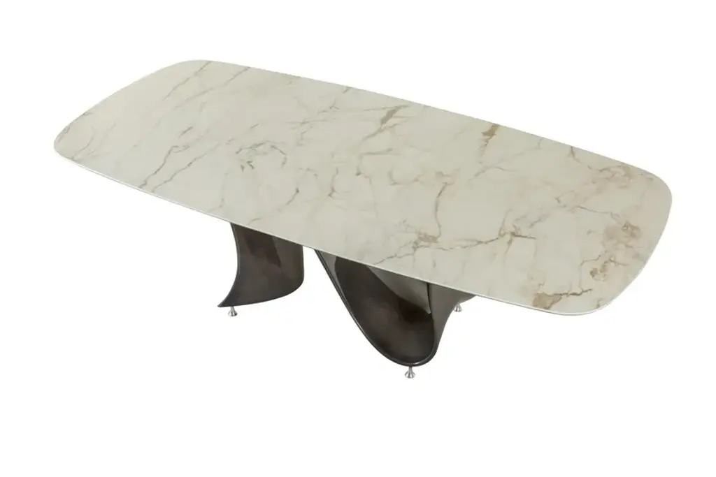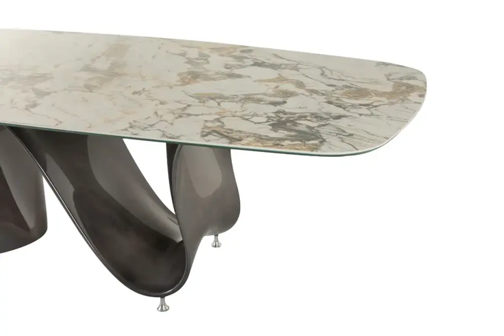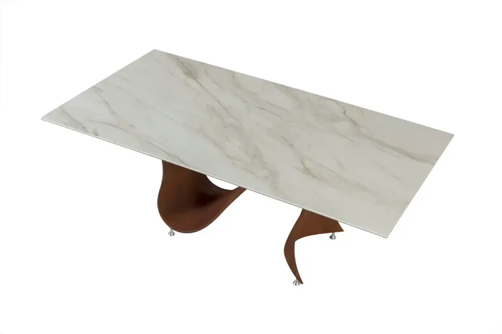 Wave is a fixed rectangular table with porcelain stoneware or ceramic glass top in various finishes, the top is available in the rectangular or shaped version, base in Baydur®.Ceramic glass top: black, dark brown, white.Porcelain stoneware top: onyx grey, statuario altissimo, Portoro, onyx amber, Emperador.Base: glossy white, glossy black, glossy beige, glossy champagne, corten (RAL colouring).Wave is the result of long and diverse techniques, based on how to work with different and innovative materials. We decided to use Baydur®, a material that allowed the base to perfectly imitate a wave’s strong movements. To counter-balance, the top was thought to look as static as possible, a line to appease and redefine the wave. It stars as pure movement; it ends as stasis.
