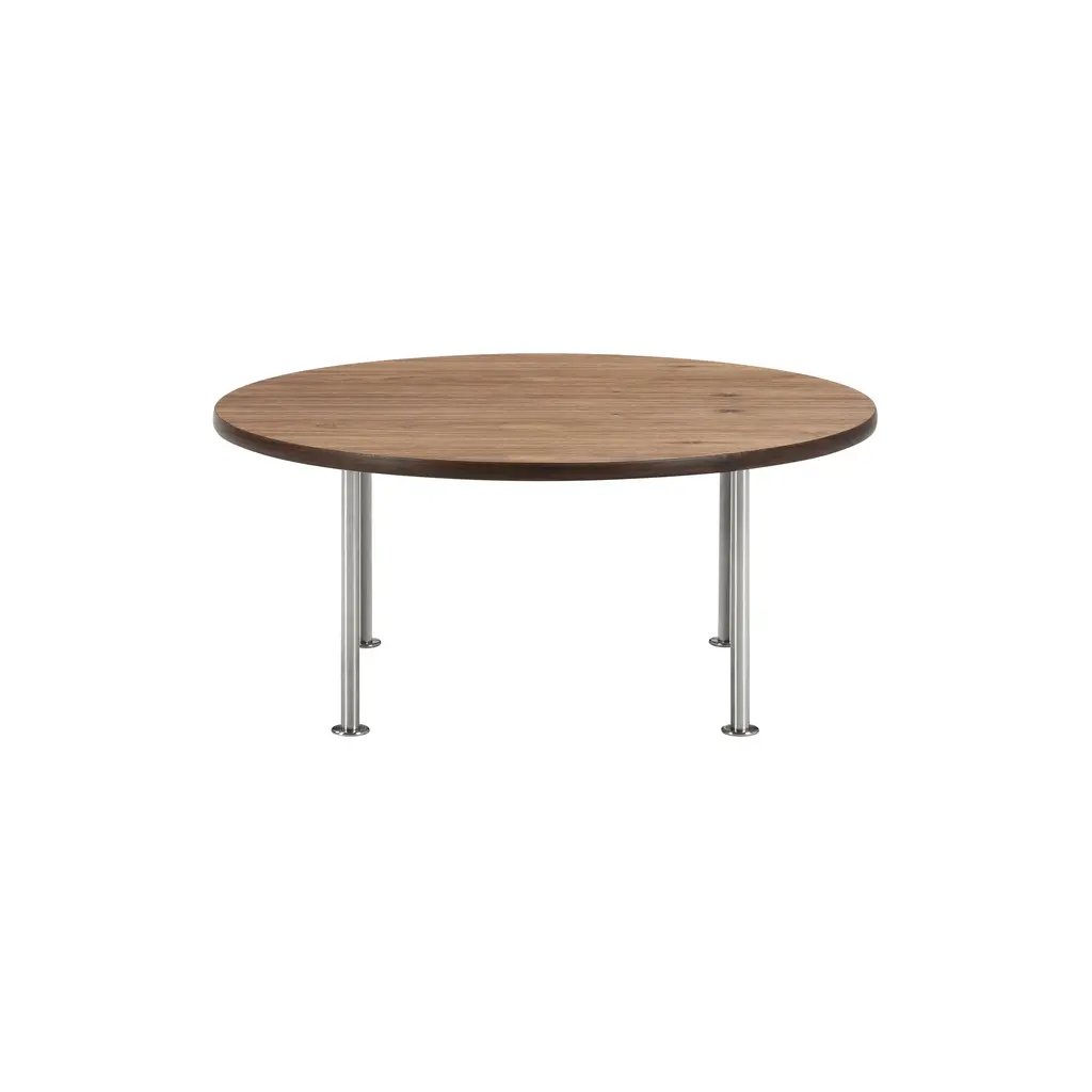 Designed in 1960 by Hans J. Wegner as part of a cohesive set with the Ox Chair and Queen Chair, the table embodies his signature approach to sculptural yet functional design. The tabletop features a veneered MDF core with solid wood edging, supported by brushed stainless steel legs.