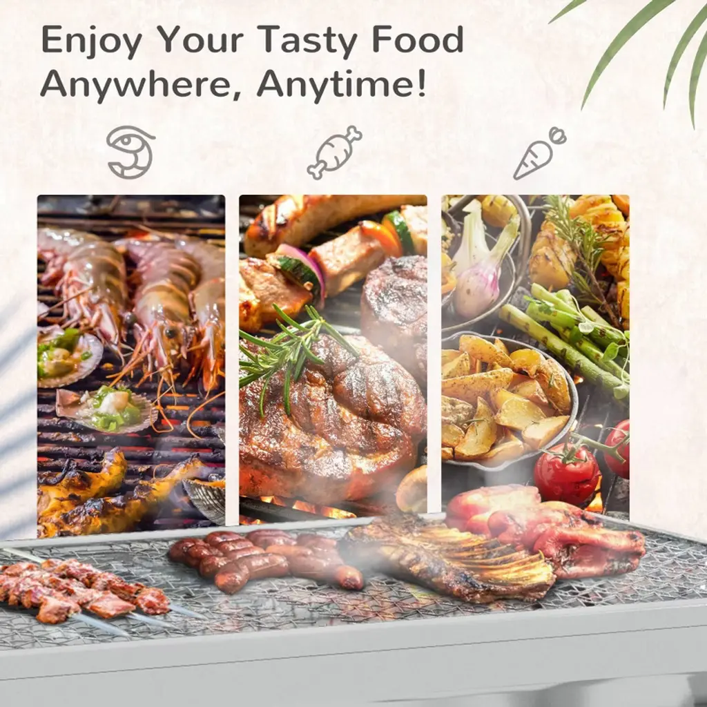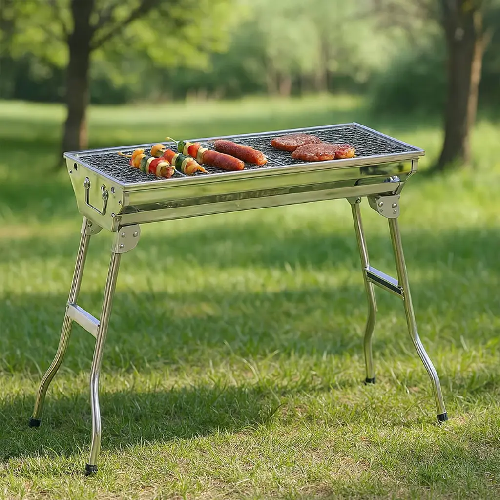 Take your grilling anywhere with this portable stainless steel charcoal BBQ grill, designed with foldable legs for easy transport. Control the heat with adjustable side vents for perfect charcoal cooking, whether you’re making yakitori, burgers, or veggies. Built from durable stainless steel, it’s rust and heat resistant for long-term outdoor use. Complete with racks, pan, shelves, hooks, and heat-safe handles, this grill is your all-in-one companion for backyard parties, camping, tailgating, and more.