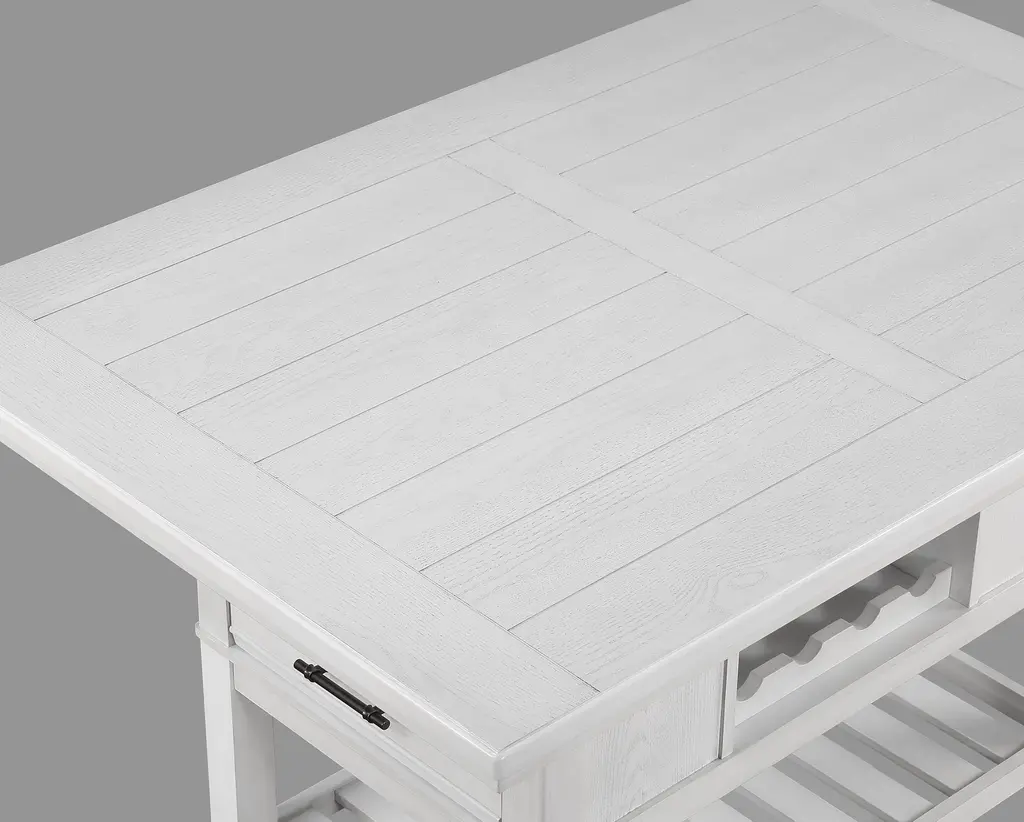 Designed with functionality in mind, this counter height table features multiple storage options. Built with one drawer and shelf on either side, and wine bottle storage shelves, this farmhouse inspired counter height table is a perfect addition to any dining space.