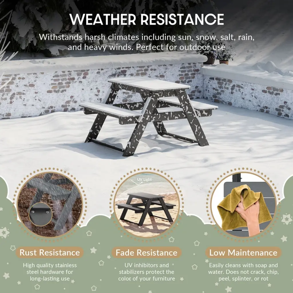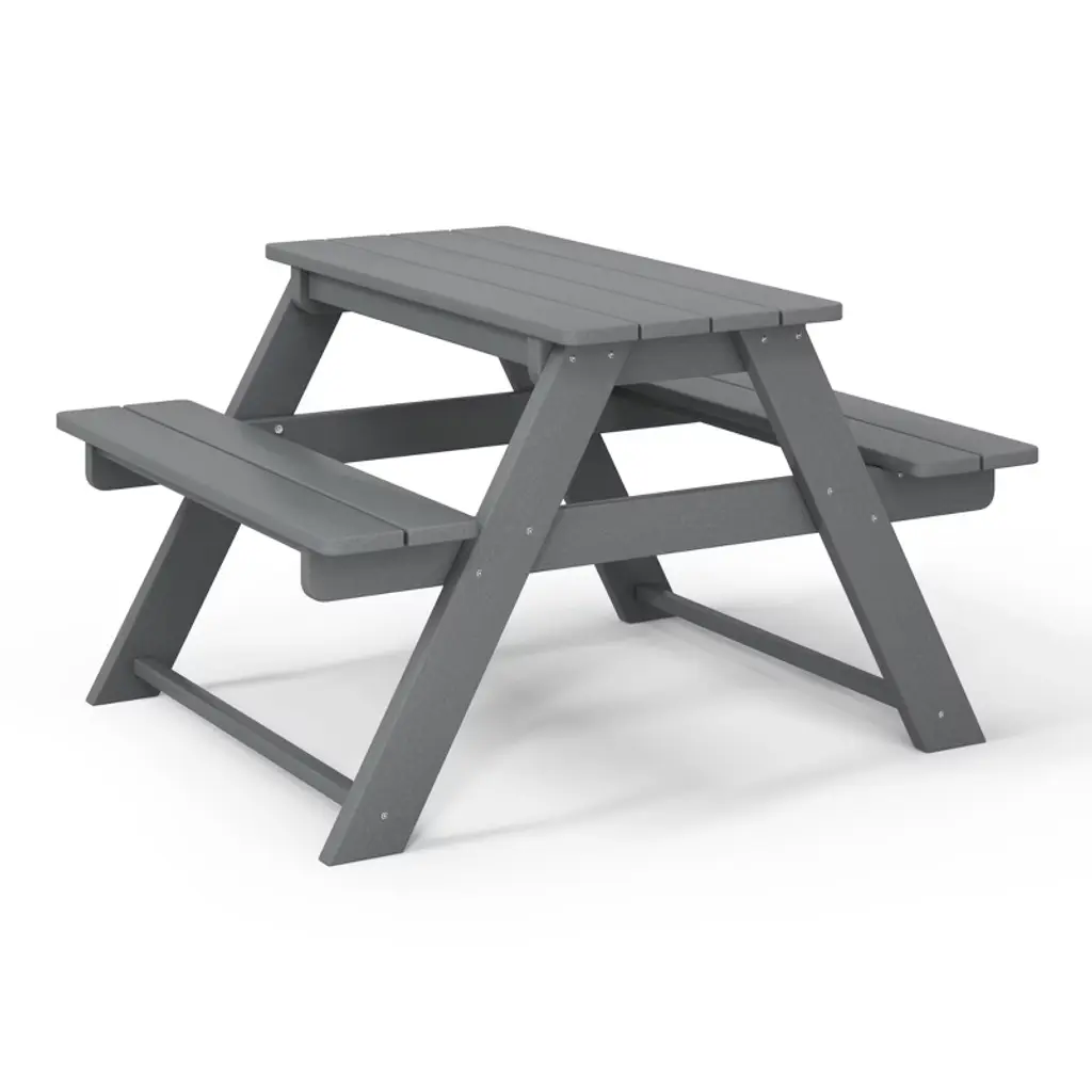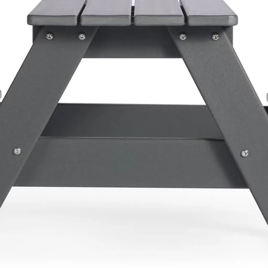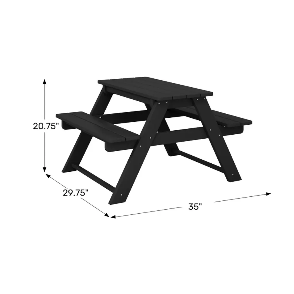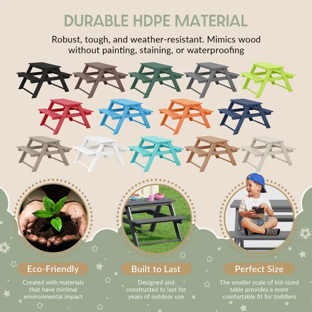 Let your little ones enjoy endless fun with our safe and durable HDPE outdoor kids picnic table. Crafted from high-quality, weather-resistant, and UV-resistant HDPE, this table is built to last, both indoors and outdoors. Its smooth edges and sturdy construction ensure a safe and enjoyable play experience. The colorful design will spark your child's imagination, making mealtimes and playtime even more fun and add more charm to your little ones exsisting kids patio furniture collection.While we strive to accurately represent product colors, please be aware that actual colors may vary slightly due to individual screen settings and lighting conditions. FeaturesConstructed from Durable HDPE Material that is Safe for your Little Ones and Designed to be Stable and SturdyWeather Resistant to Protect Against the Harsh Outdoor ElementsFade and UV Resistant to Protect Against the SunA-Frame Structure adds Extra Stability Ensuring your Little One is Safe While SittingDesigned with your Little Ones Safety in Mind with the Smooth and Rounded Edges to keep you Little One Safe from any Sharp EdgesSpacious and Wide Bench that Can Seat Up to 4 Little Ones and Designed with Your Childs Safety in Mind with the Reinforced BenchClean off Your Little Ones Artistic Drawings with Lukewarm Water, Mild Soap, and Soft Bristle Brush and for Tough Stains you can Use a Power Washer with No Worry of DamageDetails:Product Type: Picnic TablesWhat's Included: (1) Picnic TablePicnic TableDimensions: 29.75" W x 35" D x 20.75" HWeight: 38.75 lbs.