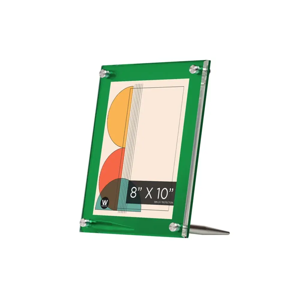 Stunning, Diamond polished beveled edge tabletop frame with clear acrylic in front and your choice of Amber, Cabernet, Kelly Green, Ruby Frost, Seaglass, or Slate on back. Float photos up to 8x10" between 10"x12" panels. Stands vertically or horizontally. Tabletop Frames make great gifts for family and friends, perfect for desks, shelves, and tables.