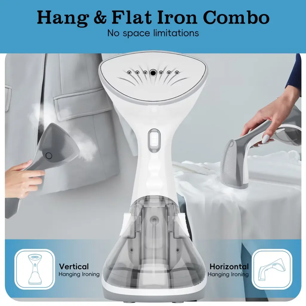 WHALL Handheld Garment Steamer is a versatile 2-in-1 device combining the power of a steam iron and a flat iron in a compact, easy-to-use design. With a strong 1200W motor, it heats up in just 25 seconds, providing fast and efficient wrinkle removal. Whether you prefer vertical steaming or horizontal pressing, this steamer adapts to your needs, making it perfect for home or travel. Equipped with an 8.79 oz removable water tank, the steamer offers extended steaming sessions without frequent refills. Its ergonomic comfort grip handle and 8-foot power cord deliver excellent maneuverability and ease of use. Both steam and dry ironing functions let you handle everything from deep wrinkle elimination to gentle fabric shaping and styling with precision. Designed for a variety of fabrics—including silk, wool, linen, chiffon, and cotton—the WHALL handheld steamer ensures professional-level results while being gentle on clothes. Features like the steam trigger, steam lock switch, and included brush frame make it ideal for thicker materials. Whether freshening business suits or prepping delicate garments, it simplifies daily wardrobe care.