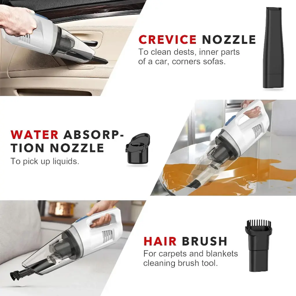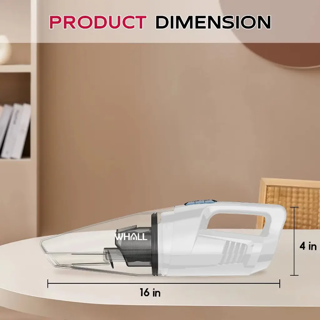 Experience the exceptional cleaning power of the WHALL cordless handheld vacuum, featuring a maximum suction of up to 8500 PA with two modes—6500 PA and 8500 PA—making it easy to tackle dust, debris, particles, and pet hair. Its lightweight and portable design is suitable for various settings, including home, office, and car. This vacuum comes equipped with multiple attachments, including a crevice nozzle, hair brush, and water absorption nozzle, as well as a washable non-woven fabric filter that effectively prevents dust from entering the motor, maintaining strong suction power. The cordless design allows for free movement during cleaning, while a noise level of only 73 dB ensures a quiet user experience. With a 500ml large-capacity dust bowl and bright LED lights, you can easily handle cleaning in dimly lit corners or at night. The quick charge technology enables the vacuum to fully charge in 4-5 hours, providing 20-30 minutes of usage, and the built-in temperature protection guarantees safety during charging.