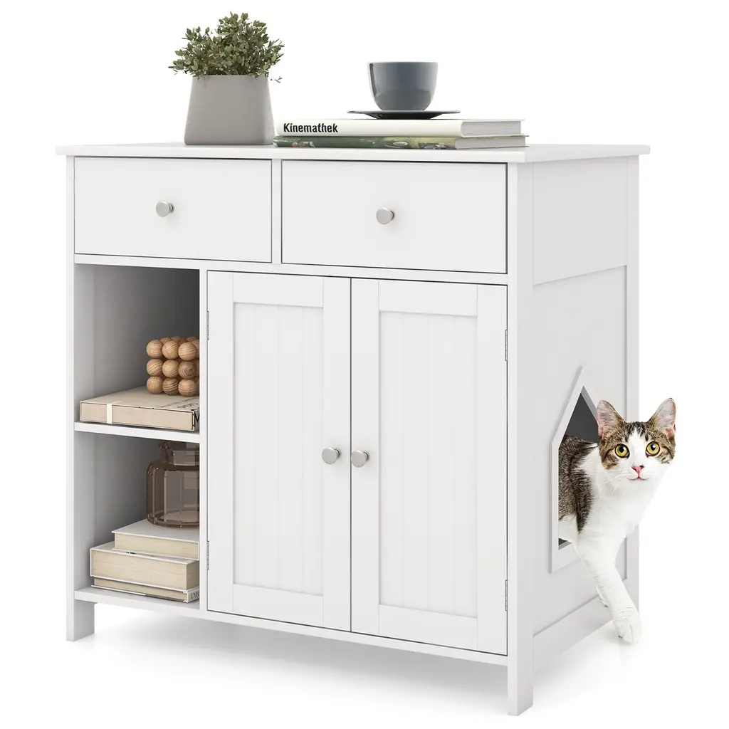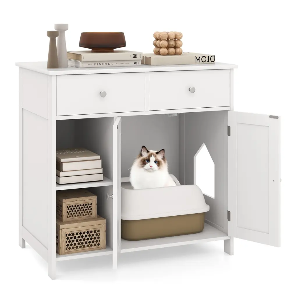 White Mdf Cat Litter Box Enclosure With 2 Drawers, Open Compartments And Stable Structure - 31.5" X 20" X 31" (L X W X H) - White