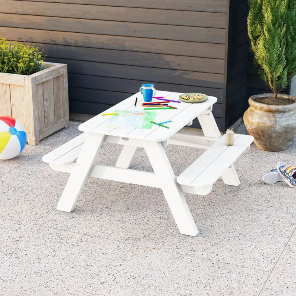 The Kids Picnic Table by POLYWOOD® is the perfect spot for snacktime or playtime. Made of weather-resistant POLYWOOD, a proprietary blend of plastics designed to last season after season, this kid-size table is easy to cleanso the only thing you need to do is sit back and watch your little ones have some backyard fun.