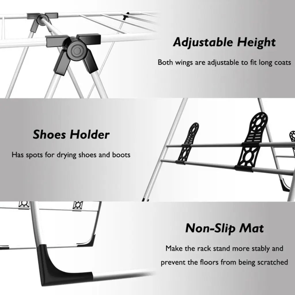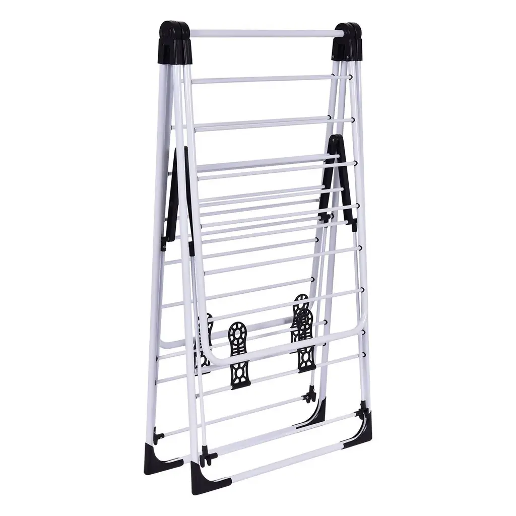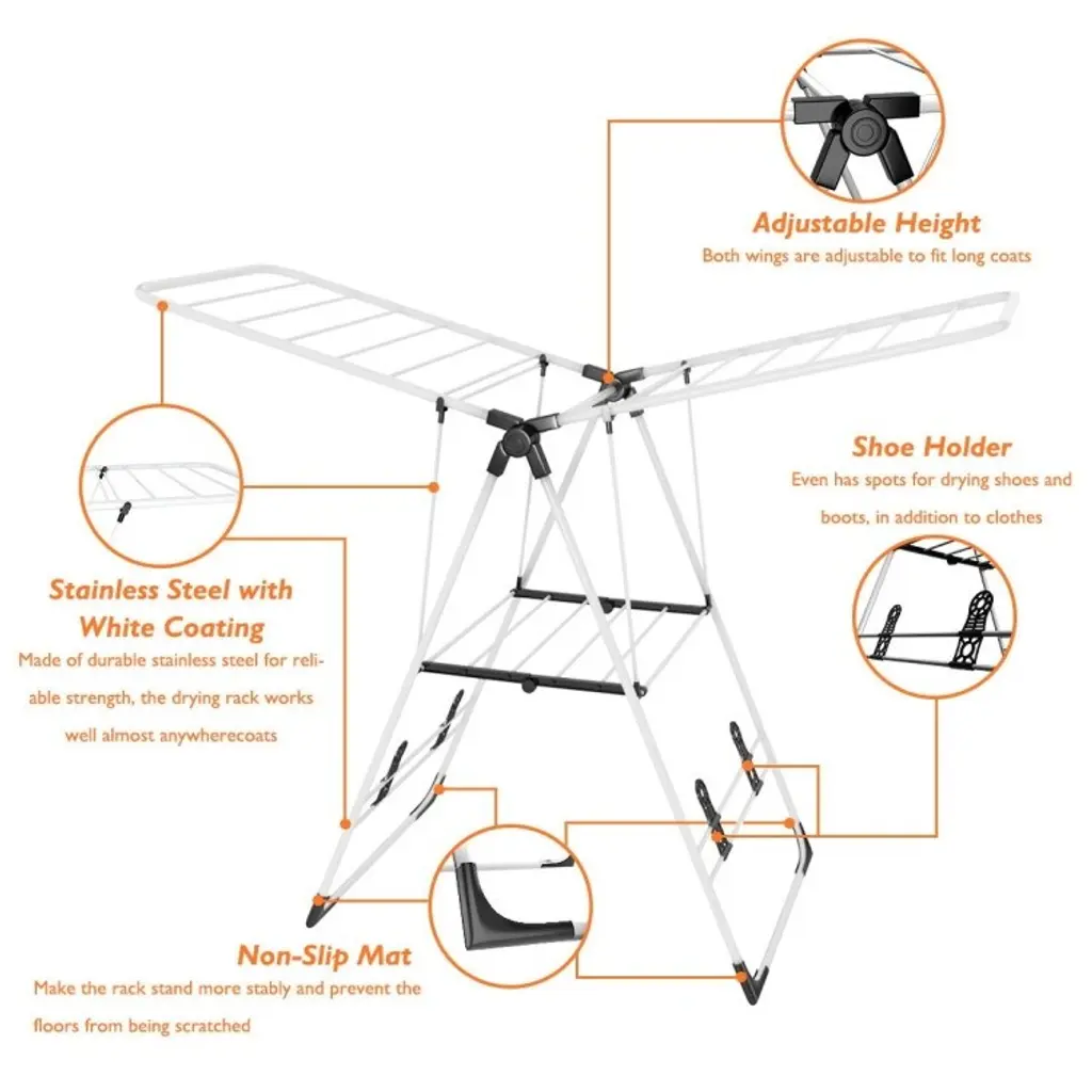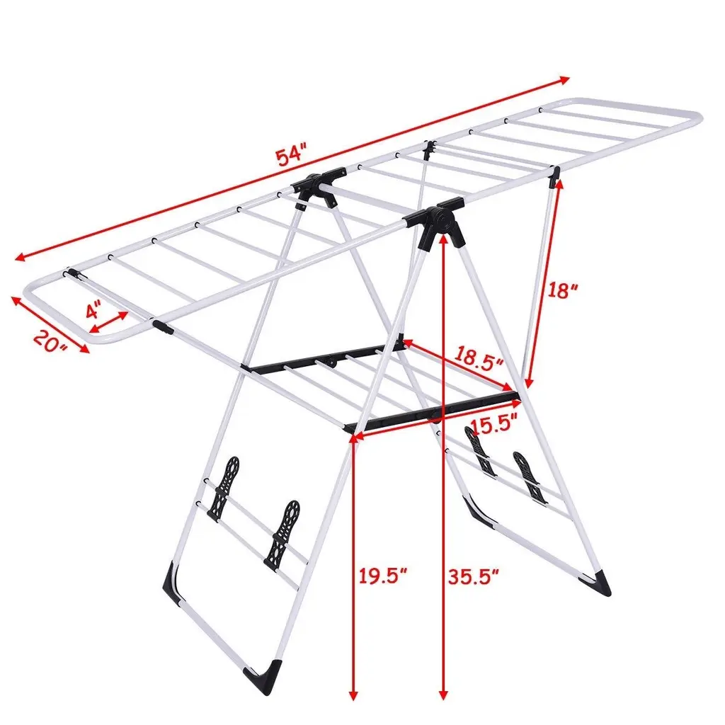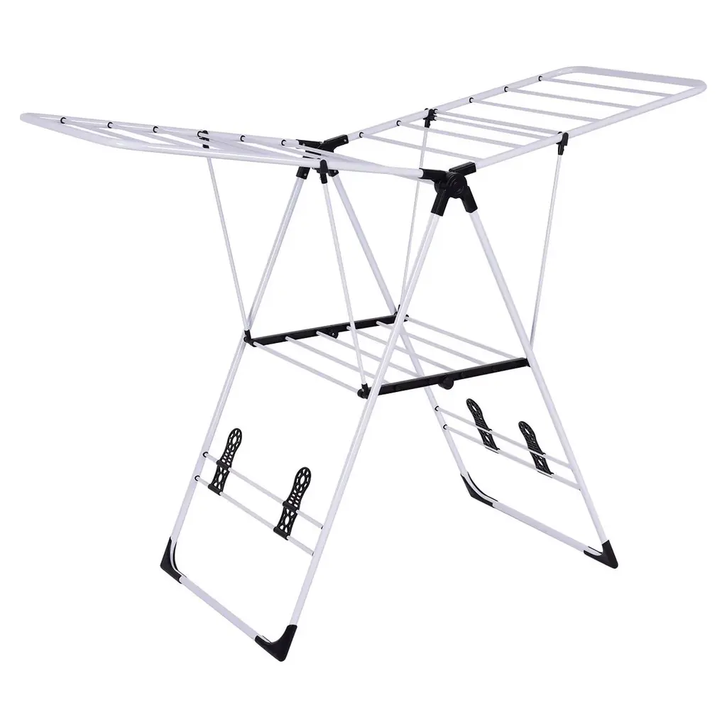 SpecificationsKey Features● Multi-functional Design: With expansive top planar area and multiple rails, this Tangkula drying rack can support large load clothes. And the bottom rack will accommodate your shoes, slippers, hats, and so on. And the wings can be adjusted by placing the support arms in different positions for flat drying or for hanging tall items. ● Lightweight and Portable Style: The weight of our drying rack is only 5.5 lbs, which means that you can move it from here to there with much effort. And the foldable design makes transportation and storage much easier. ● High Quality Material: The drying rack comes with 2 shelves. It's made of rust-proof coating steel, strong and last long, proper for indoor or outdoor use. Besides, it can support 26.4 lbs clothes and other accessories. ● Easy to Use and Maintain: Our clothing drying rack needn't any assembly, you can just open and use it after you get a folded drying rack. And it is quite easy to set up and takedown. As for cleaning, you can just wipe it with a wet cloth.Overview:This portable laundry clothes storage drying rack is an ideal choice for families to have the clothes well-organized. Made of rust-proof coating steel and sturdy plastic joints, the drying rack is durable and lightweight. It is easy to use and can be opened and closed quickly. The two side wings can be lifted independently and can be adjusted in different heights and positions. It can be easily folded away for compact storage. With this terrific drying rack, a lot of unnecessary trouble would be saved.