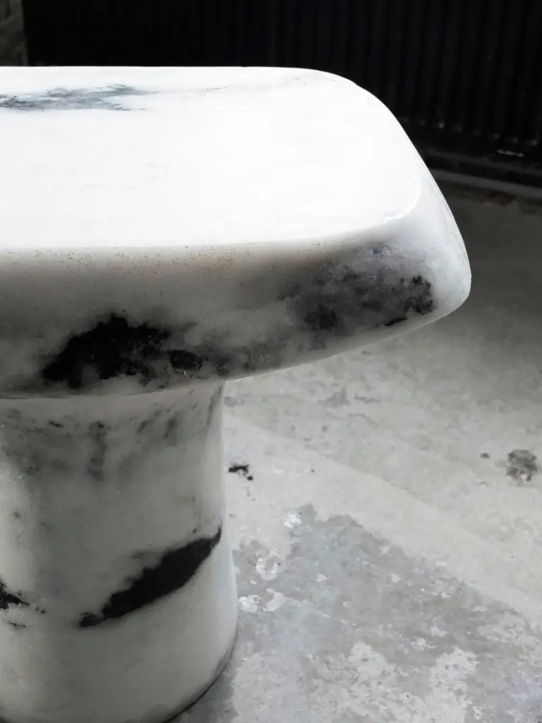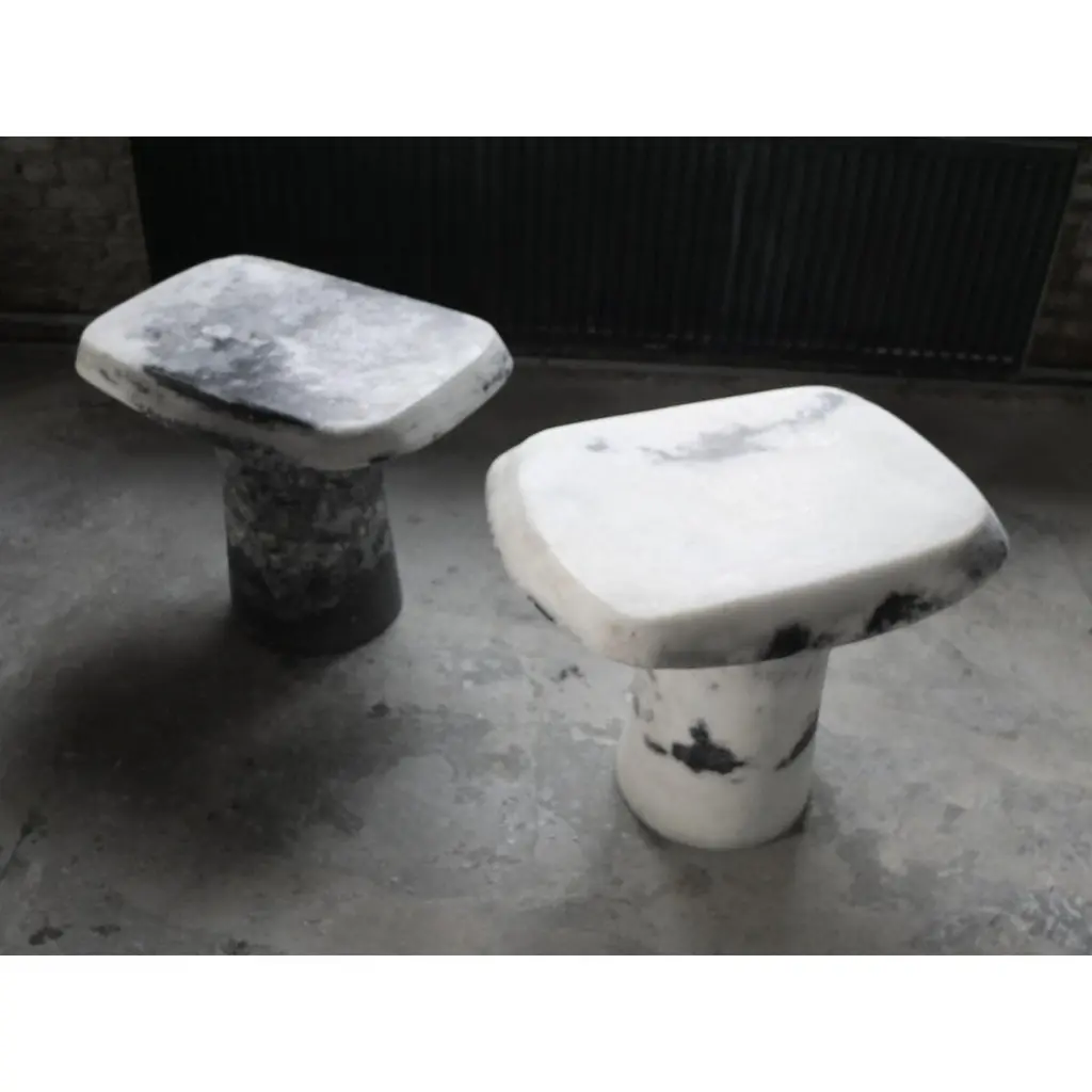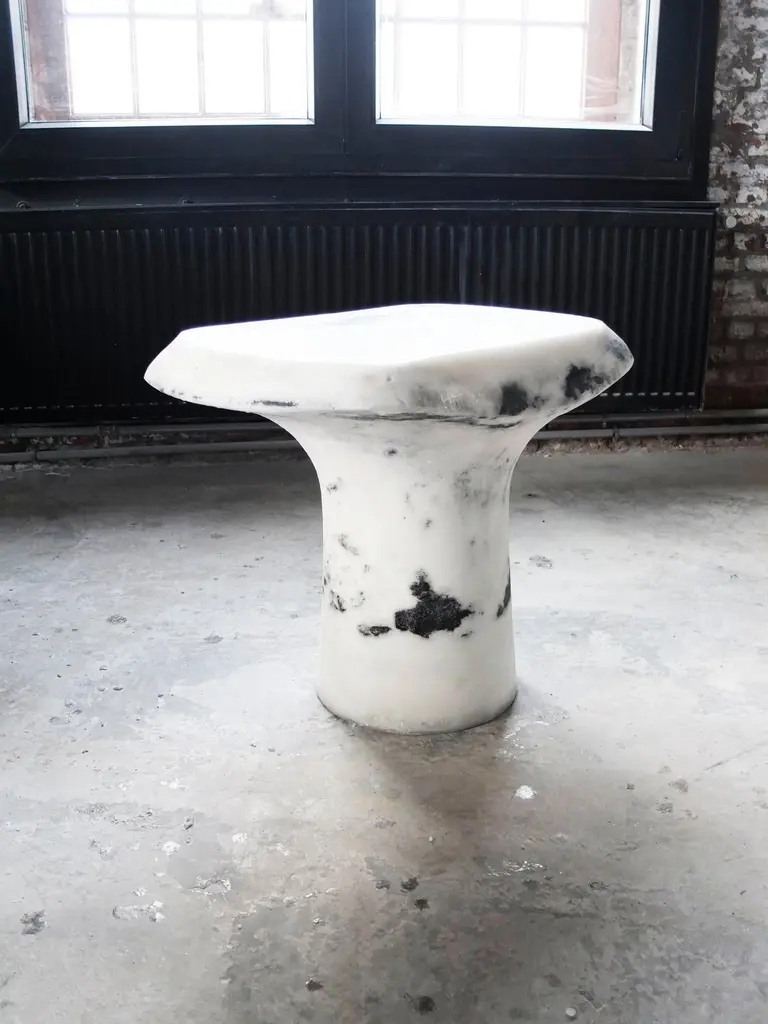 White T table by Roxane LahidjiDimensions: D 60 x W 40 x H 50 cm.Materials: Marble salt.Weight: 50 kgRoxane Lahidji is a social designer specializing in ecological material developments and applications. Her research focuses on achieving luxurious-looking objects and surfaces from low costs and raw resources.In this sense, she seeks to redefine the meaning of the objects she makes by balancing local and renewable resources, environmentally friendly production processes, and essential human values. With the deep concern of conciliating production and sustainability, her design uses disregarded or cheap materials brought to a new life, while twisting low-tech methods and traditional crafts techniques She describes her practice as an alchemical journey by developing her own transforming and molding methods.Roxane Lahidji was born in Paris in 1992 and grew up in the French capital before studying illustration and product design in Strasbourg (HEAR). After graduating from the Social Design department of Design Academy Eindhoven in 2017, Roxane Lahidji developed her project ‘’Marbled salts’’ and was awarded among the 100 best French international designers by FD100 price of the VIA and won the 2019 Bolia award.