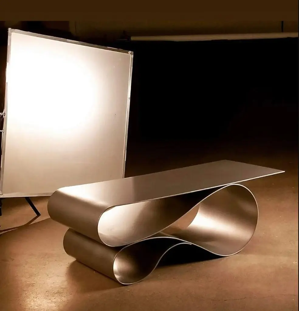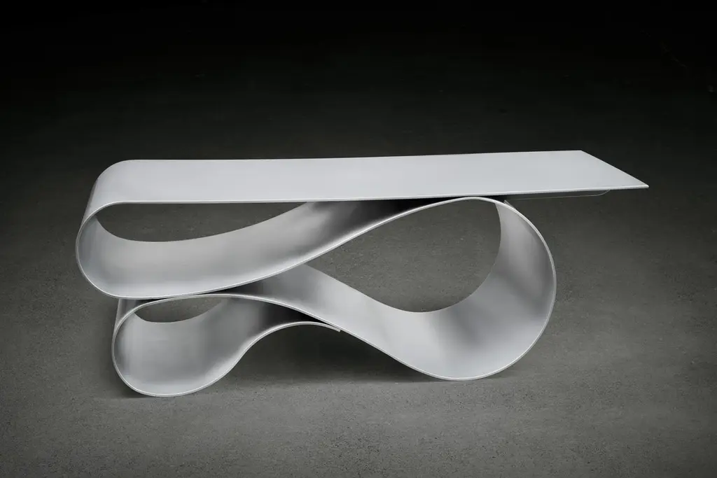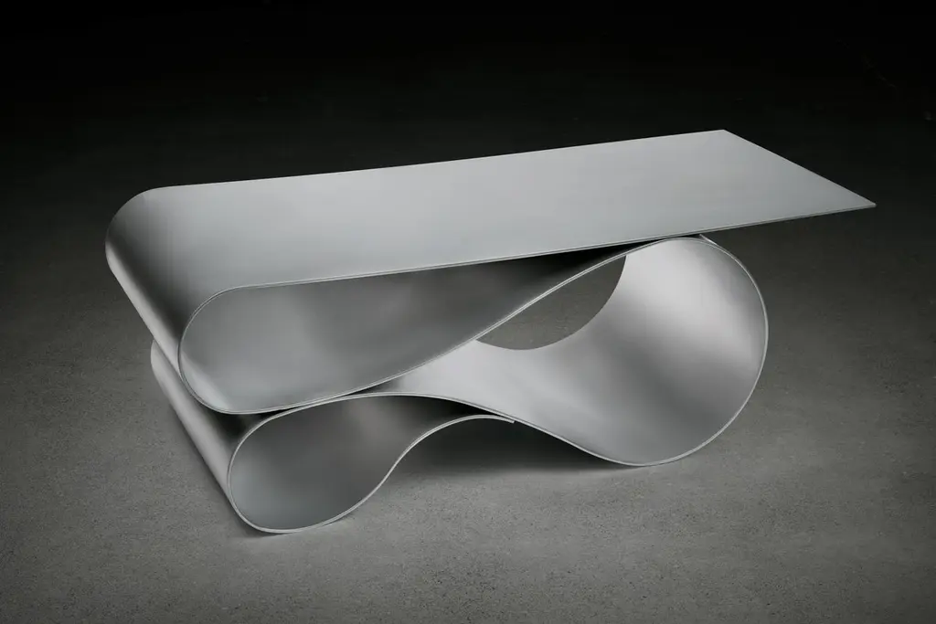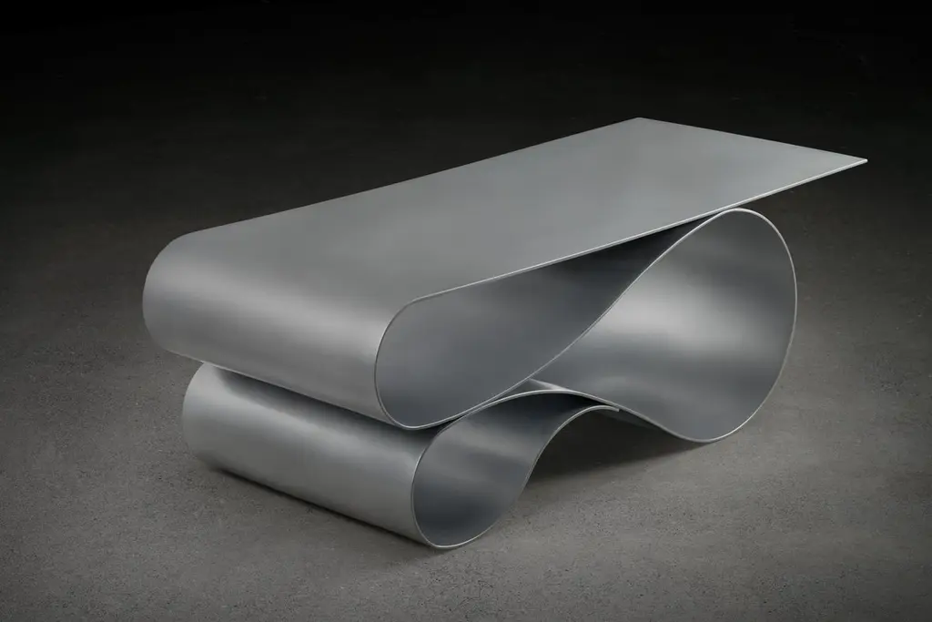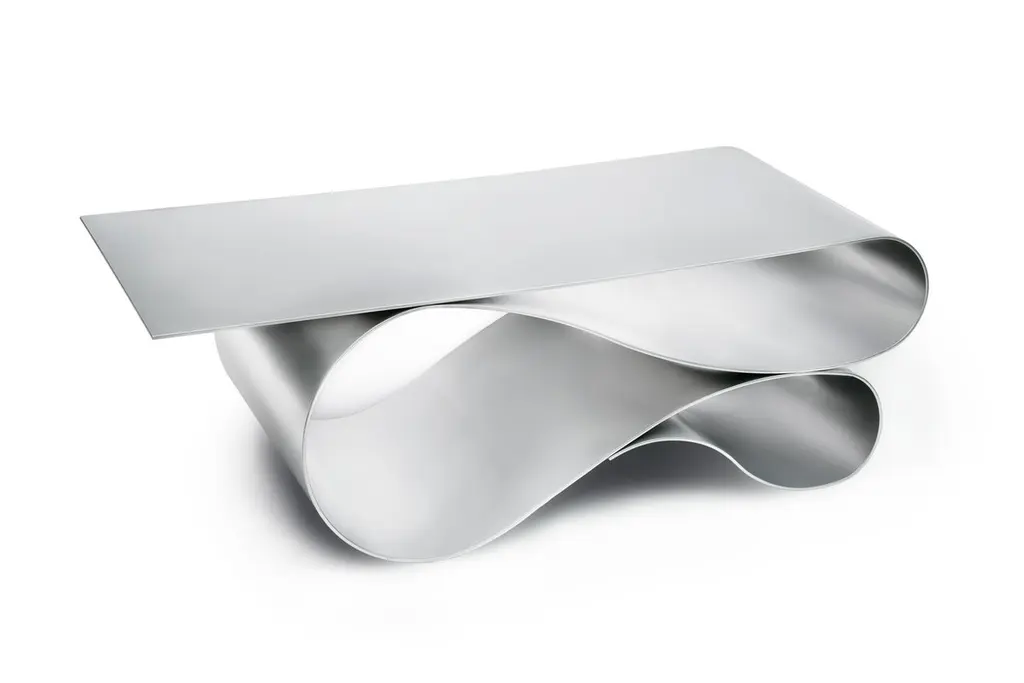 The iconic and lyrical form of the award winning Whorl Table series. First designed and made in Concrete Canvas and now executed in powder coated aluminum. 1/4" thick aluminum is hand-crafted into the magical folds of the Whorl form. This is a very elegant and powerful statement piece that blurs the distinction between art and craft. Featured in the book "Artisan Design- Collectible Furniture in the Digital Age", by Judith Gura. Shown here in silver color . This unique table may be customized to any color and finish available.Materials: Powder coated aluminum.Dimensions: 55” long x 23.5” wide x 18” high. Dimensions can be modified.