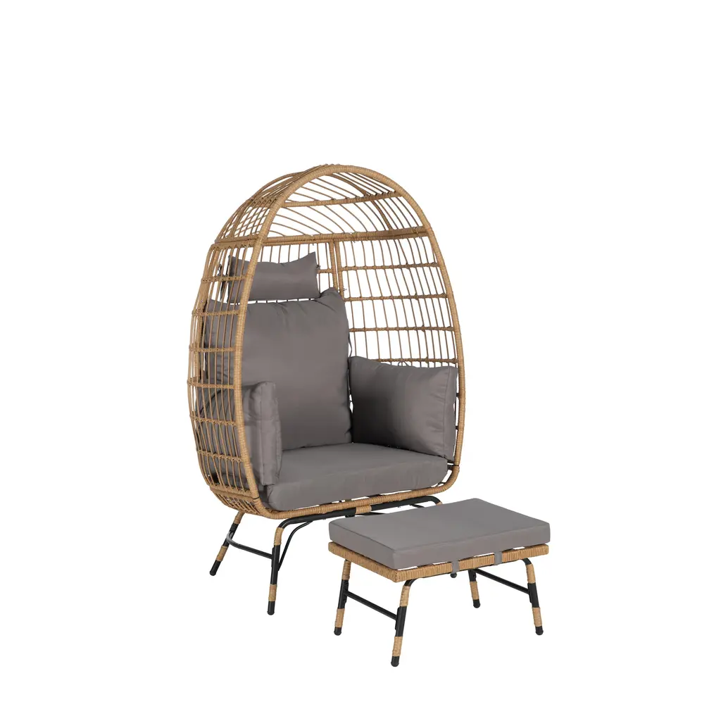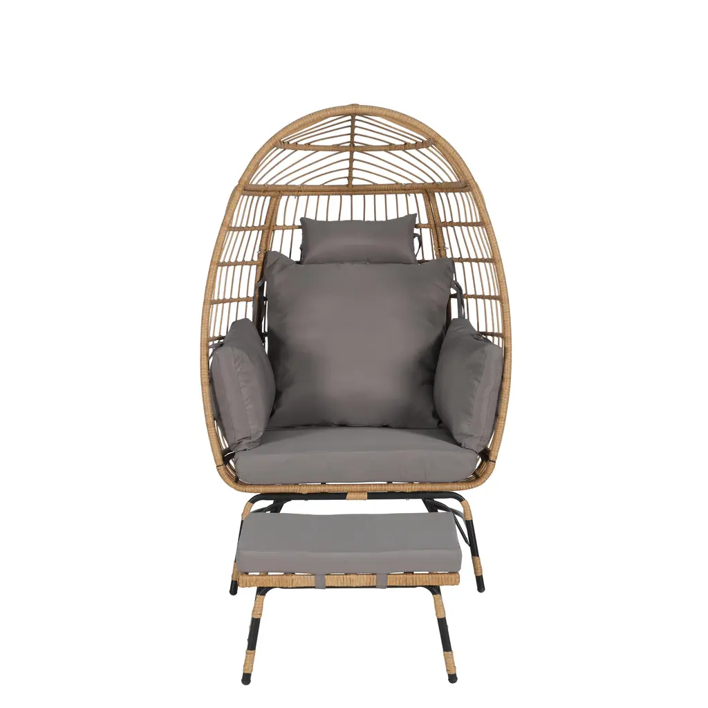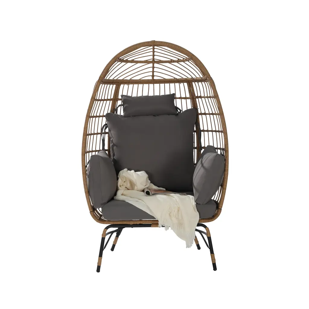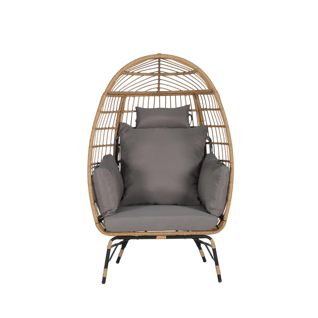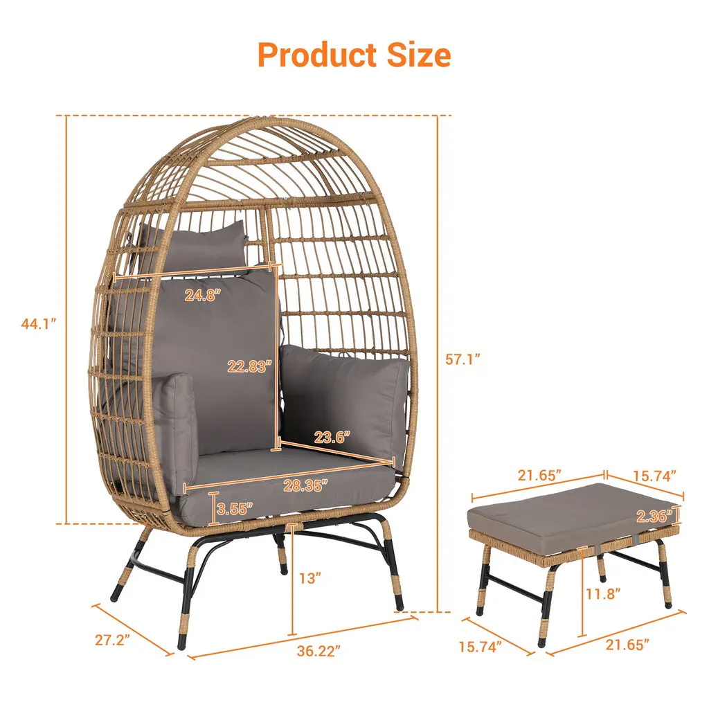 This outdoor egg chair for patio is designed with a staggering weight capacity of 500 pounds.The high quality cushion fabric makes this patio egg chair more durable, as it does not fade when exposed to water or harsh weather conditions.The levelers under its legs can be easily adjusted for added stability.With a generous 6-inch thickness seating cushion and a neck cushion, this wicker egg chair outdoor provides unmatched comfort.
