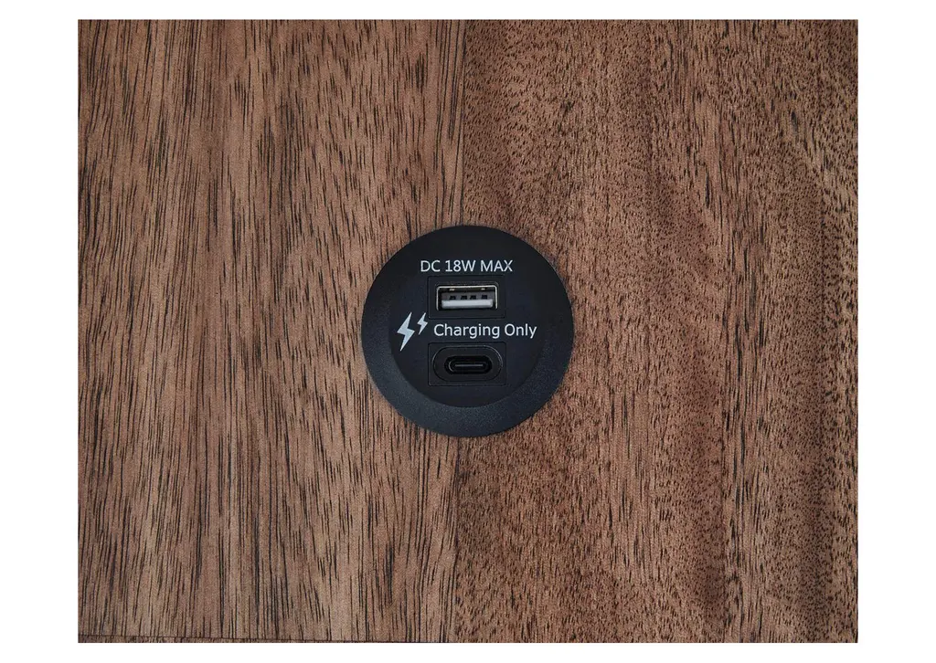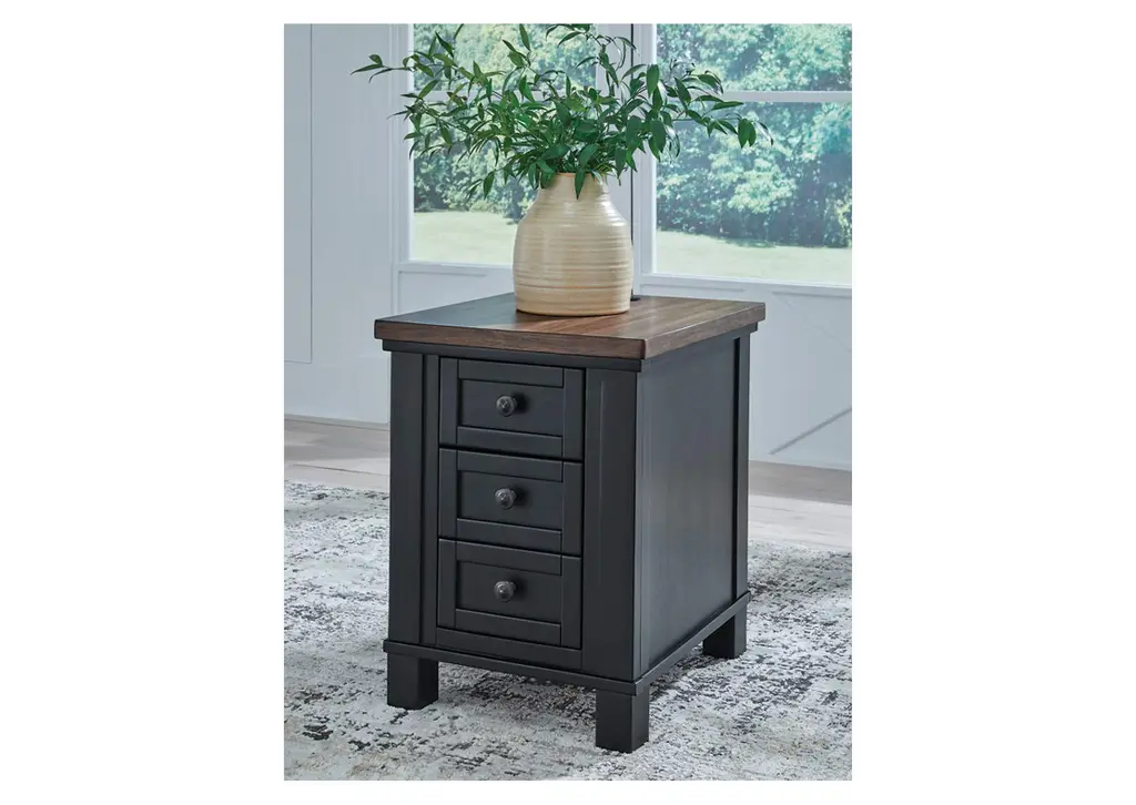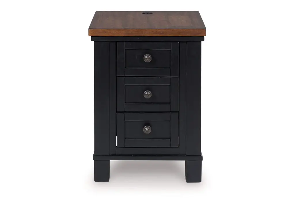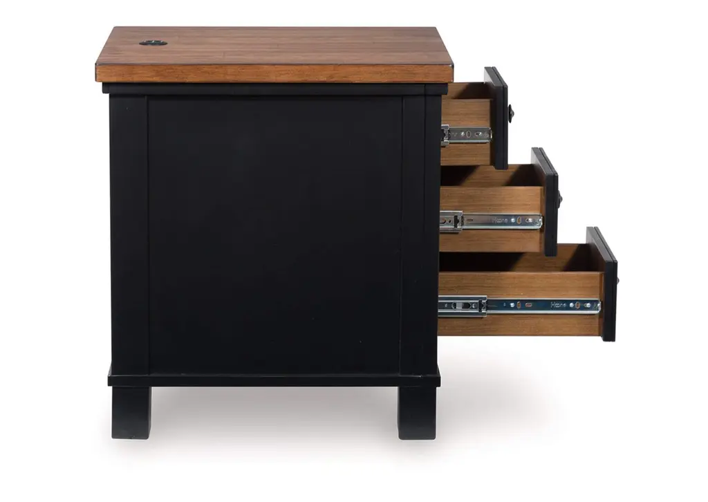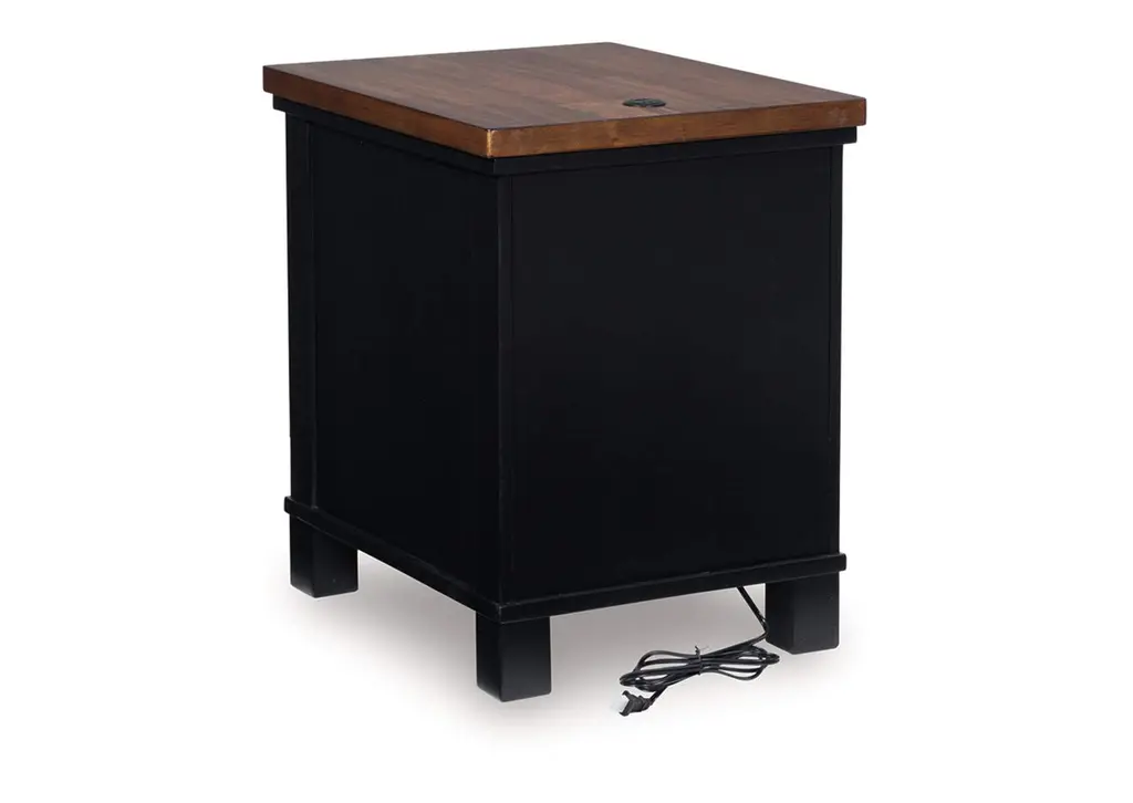 Raise the bar on modern farmhouse style with the Wildenauer chairside end table. Its sturdy silhouette and casual good looks are accentuated with a two-tone finish, which pairs a warm satin black base with a contrasting butcher block veneer top. Spacious storage drawers and dual USB charging ports keep devices powered up and close at hand. Whether your style is vintage, country or eclectic, this table adds a hearty element. Weight 62.000 lbs. (27.9kgs.)