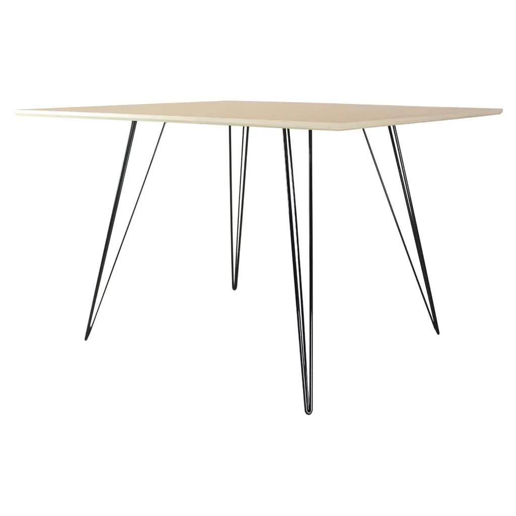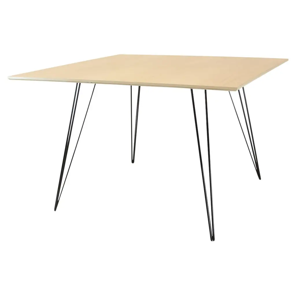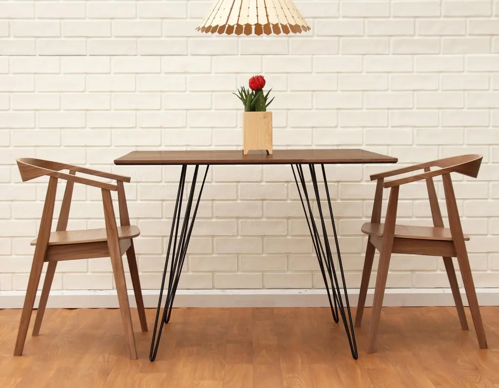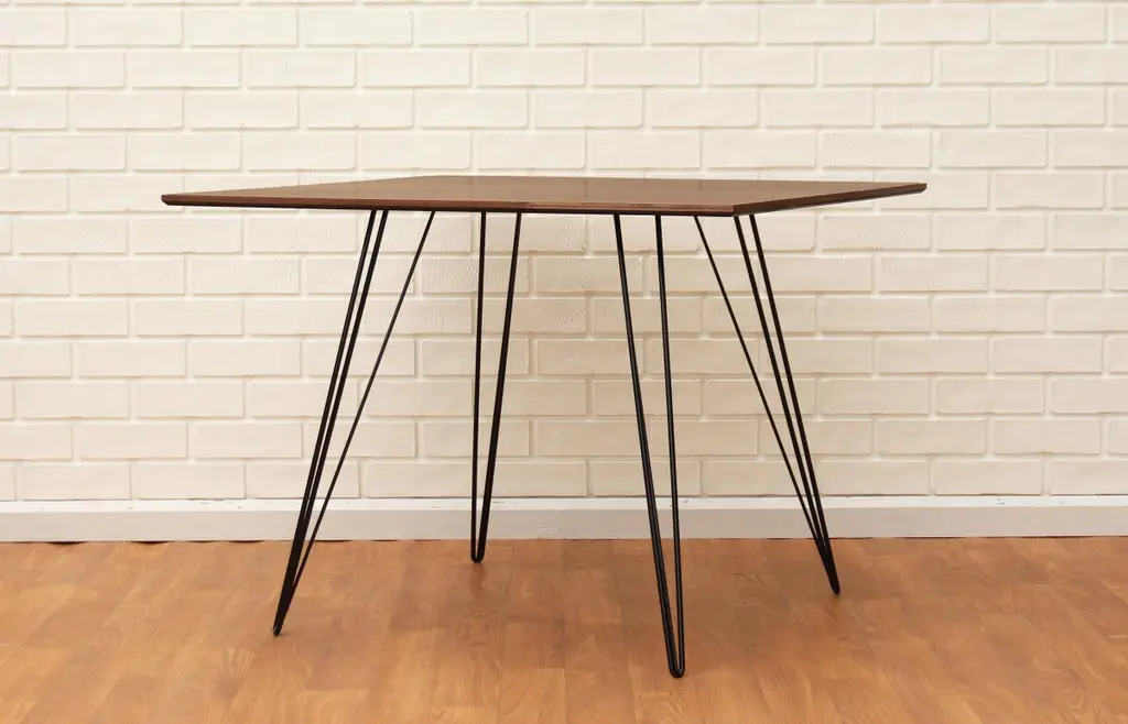 A thin, elegant and light table that can be customized to any shape, size and color desired. This handcrafted item perfectly blends industrial hairpin legs with a beveled wooden top. The irregular beauty of its natural wood combined with its simple elegant base creates a timeless, original design. This piece is offered in dinning and coffee heights as well as several shapes and sizes including large and small: rectangle, oval, square, and circle.