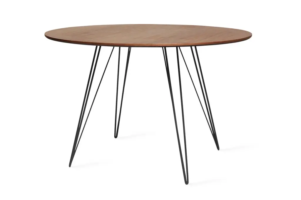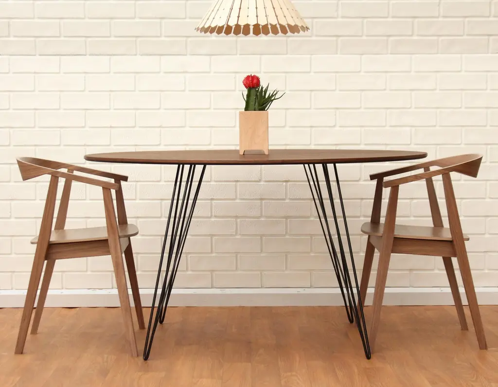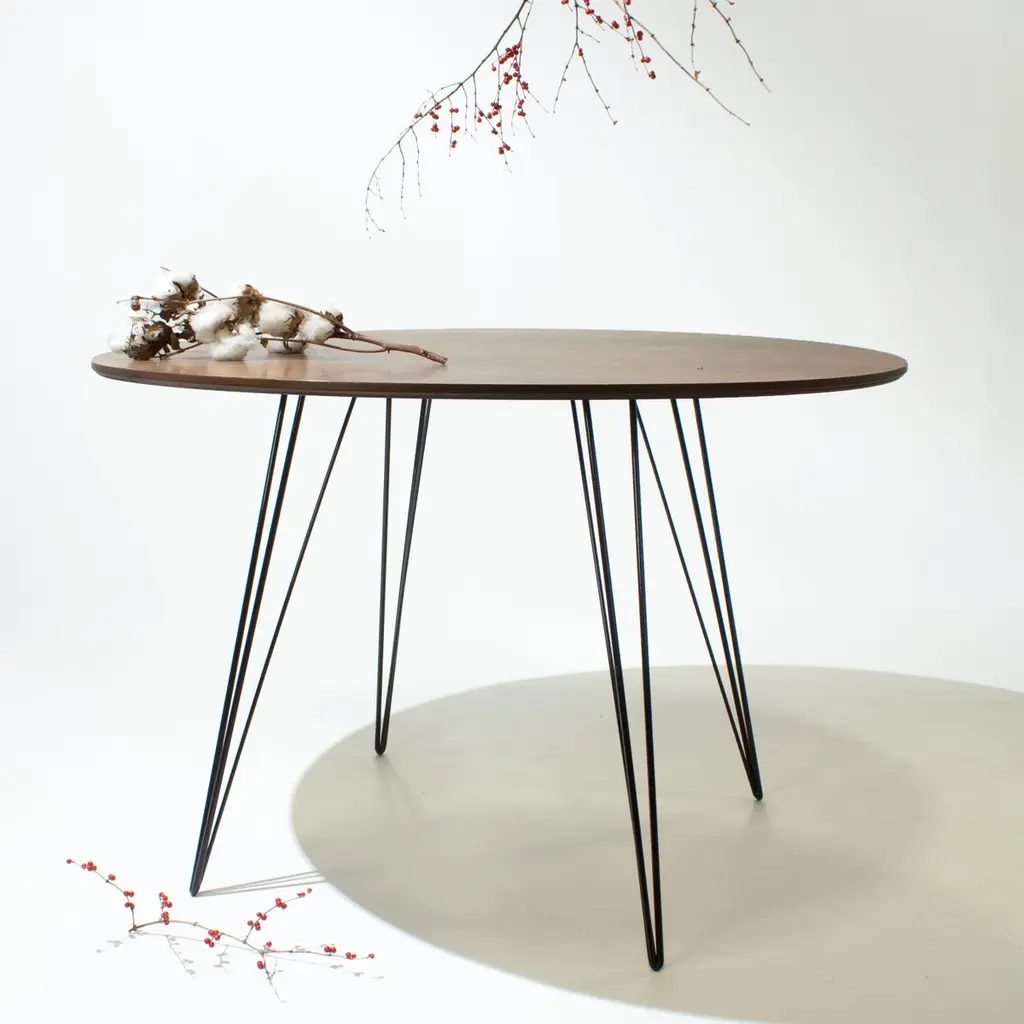 A thin, elegant and light table that can be customized to any shape, size and color desired. This handcrafted item perfectly blends industrial hairpin legs with a beveled wooden top. The irregular beauty of its natural wood combined with its simple elegant base creates a timeless, original design. This piece is offered in dinning and coffee heights as well as several shapes and sizes including large and small: rectangle, oval, square, and circle.