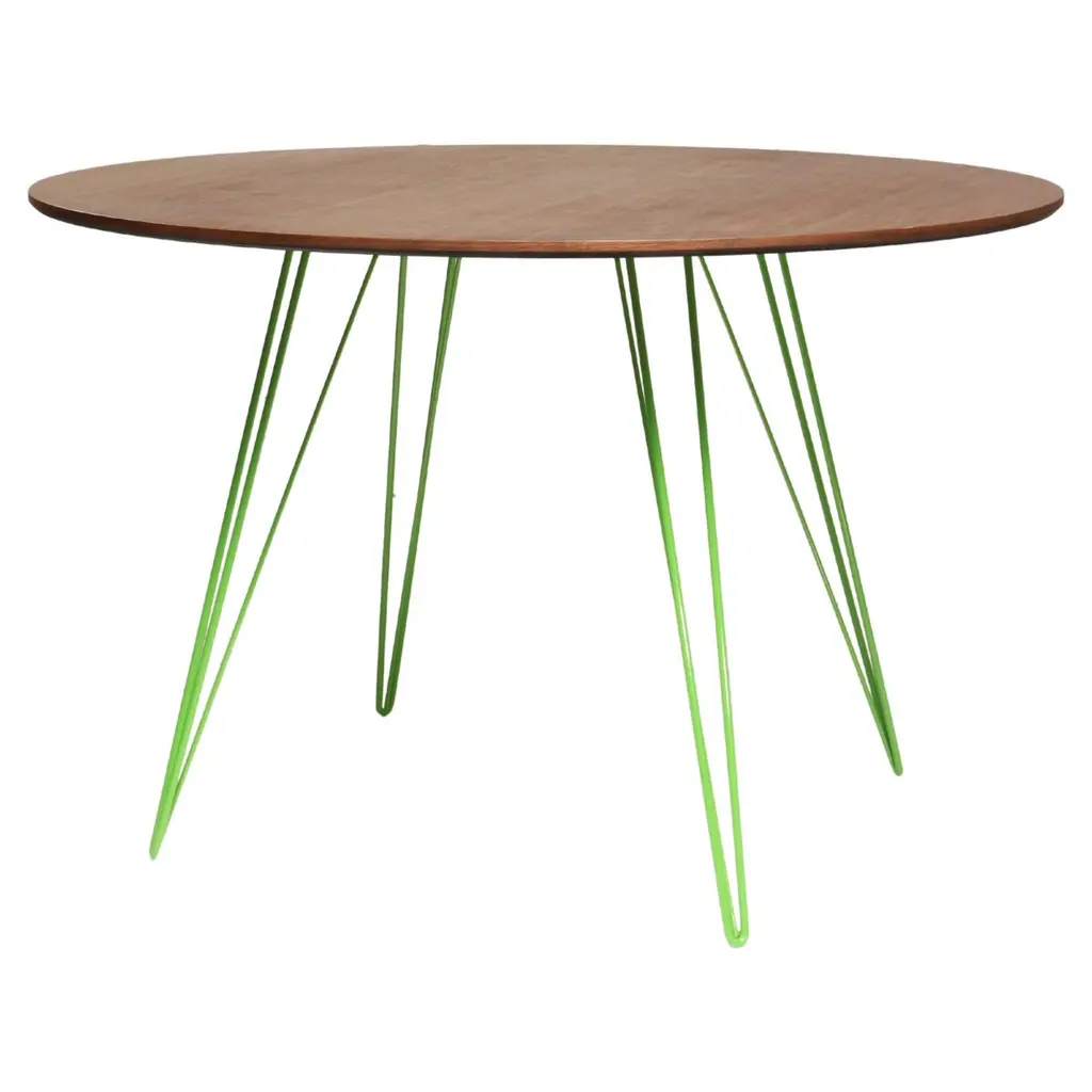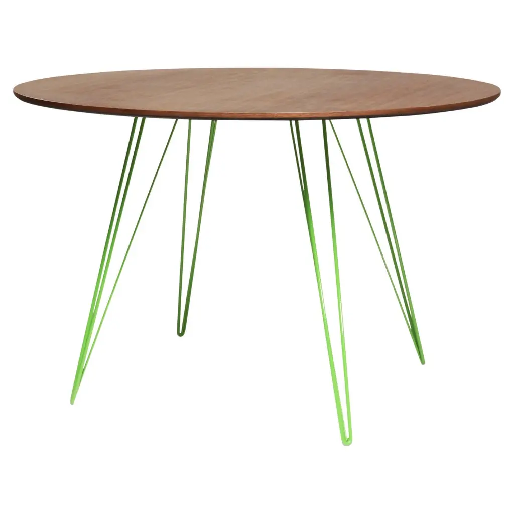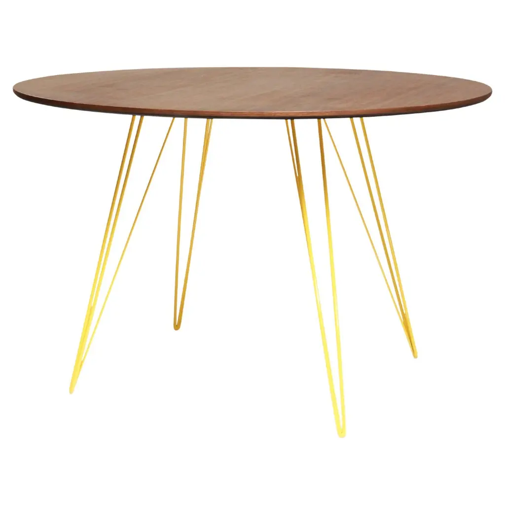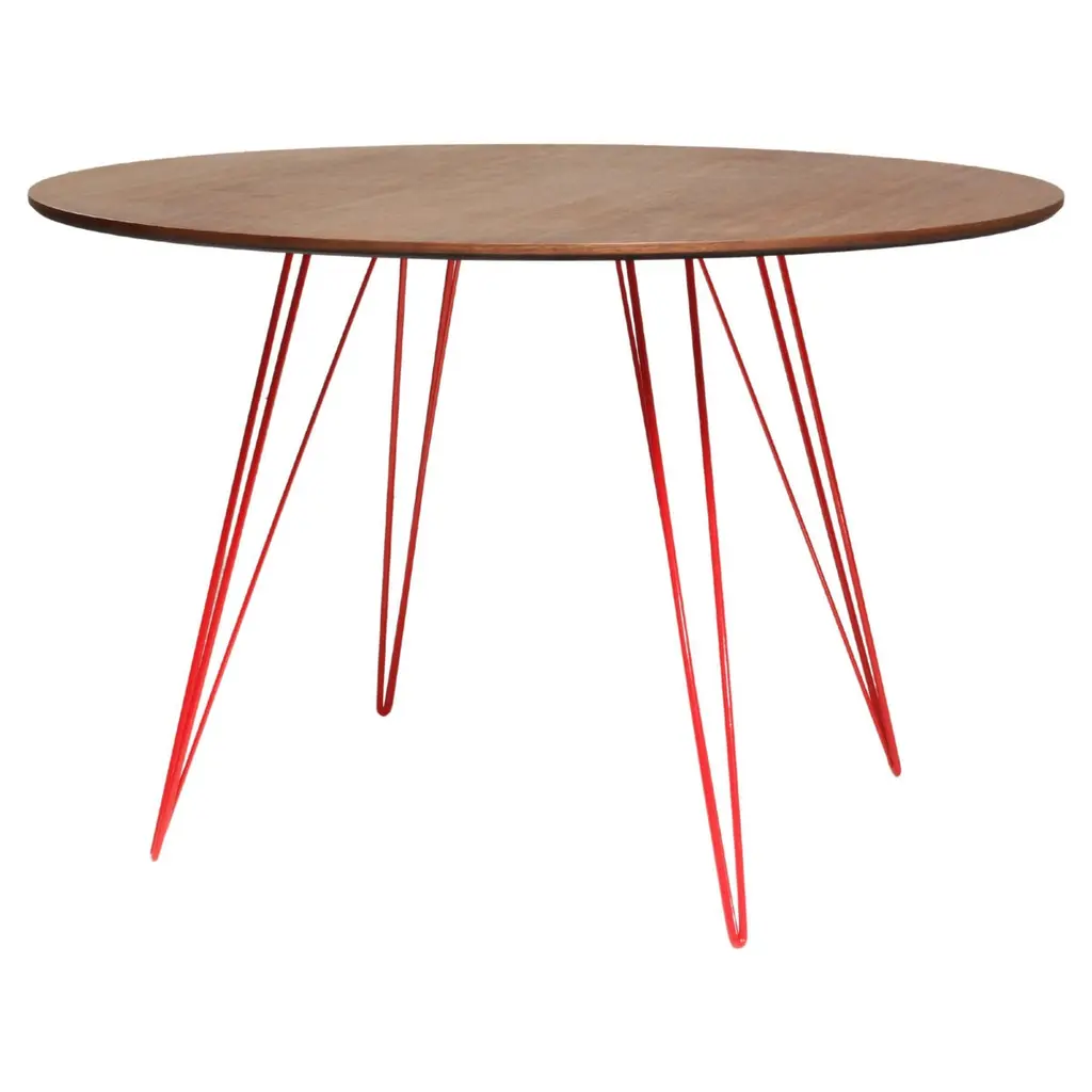 A thin, elegant and light table that can be customized to any shape, size and color desired. This handcrafted item perfectly blends industrial hairpin legs with a beveled wooden top. The irregular beauty of its natural wood combined with its simple elegant base creates a timeless, original design. This piece is offered in dinning and coffee heights as well as several shapes and sizes including large and small: rectangle, oval, square, and circle.