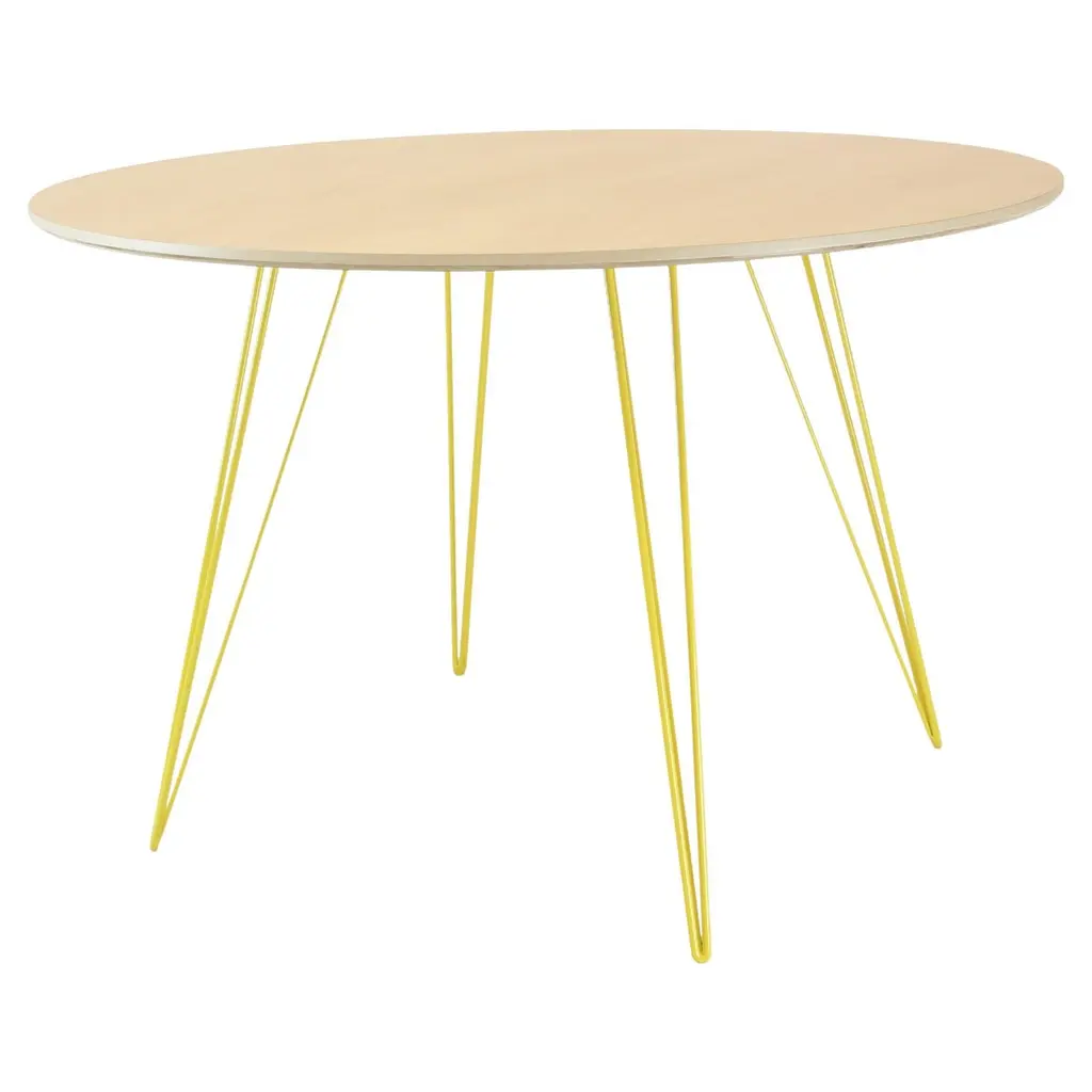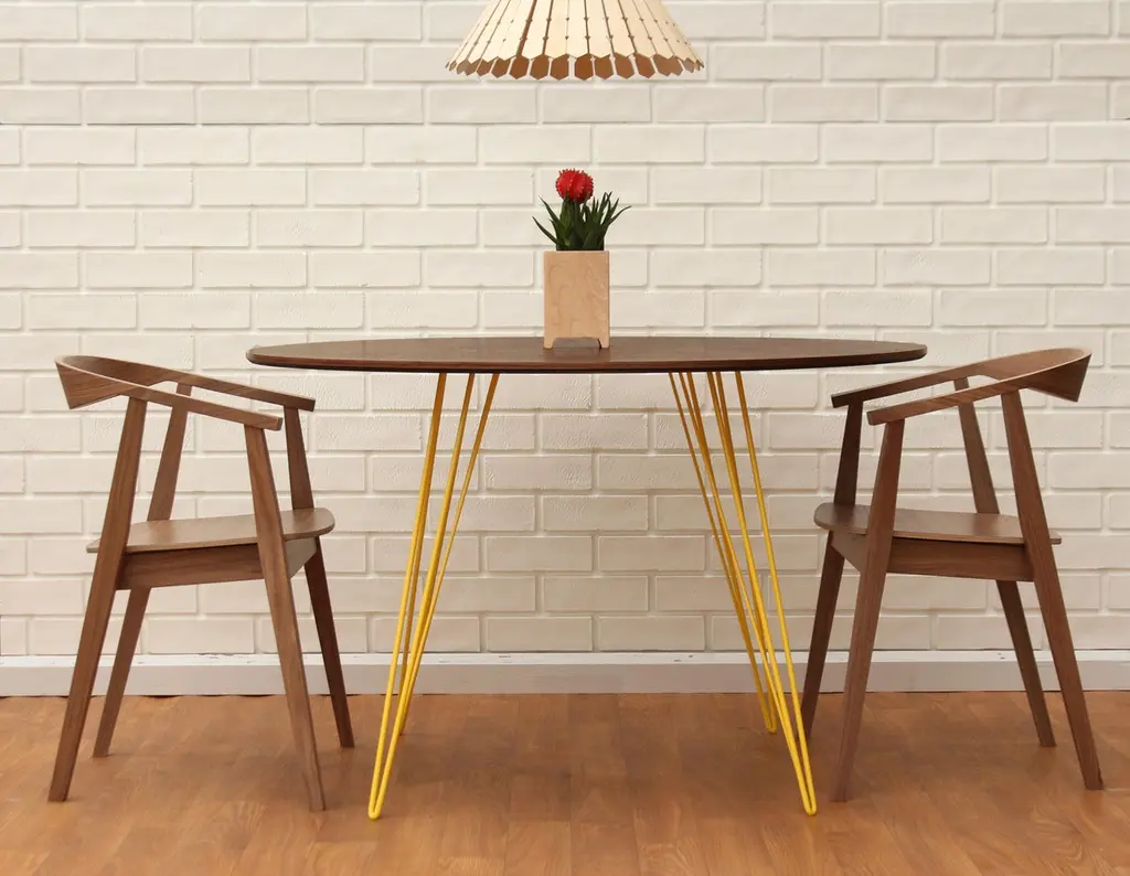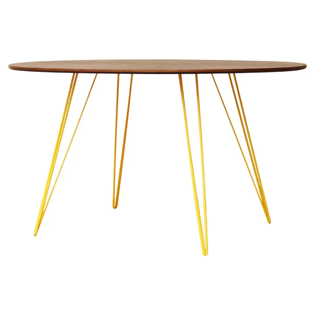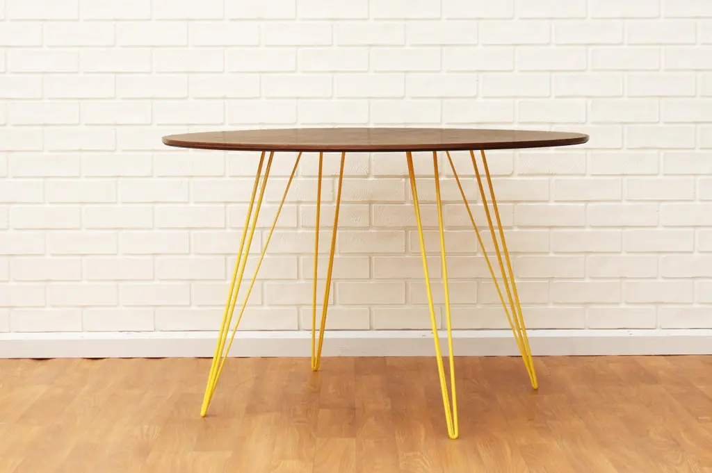 A thin, elegant and light table that can be customized to any shape, size and color desired. This handcrafted item perfectly blends industrial hairpin legs with a beveled wooden top. The irregular beauty of its natural wood combined with its simple elegant base creates a timeless, original design. This piece is offered in dinning and coffee heights as well as several shapes and sizes including large and small: rectangle, oval, square, and circle.