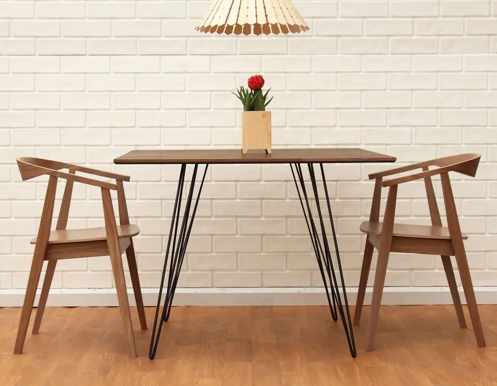 A thin, elegant and light table that can be customized to any shape, size and color desired. This handcrafted item perfectly blends industrial hairpin legs with a beveled wooden top. The irregular beauty of its natural wood combined with its simple elegant base creates a timeless, original design. This piece is offered in dinning and coffee heights as well as several shapes and sizes including large and small: rectangle, oval, square, and circle.